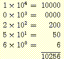 ¶ÇÇÑ 10256 À̶õ ¼ö¸¦ ´Ù¼¸ °³ÀÇ 10 Áø¼öÀÇ ÇÕÀ¸·Î Ç¥ÇöÇÒ ¼ö ÀÖ´Ù. Áï ´ëÀÀÇÏ´Â 10 ÀÇ ¸è¿¡ ÀÇÇØ¼ °¢ ¼ýÀÚ¿¡ °öÇϰí, ±×°ÍµéÀ» ´Ù½Ã ´õÇÑ´Ù.