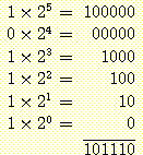 2 Áø¼ö¸¦ 10 Áø¼ö·Î ¹Ù²Ù±â À§Çؼ °¢°¢ÀÇ ¼ýÀÚ¸¦ 10 Áø¼ö (decimal) ·Î ¹Ù²Ù°í ±× 10 Áø¼ö¸¦ ´Ù½Ã ´õÇÏ¸é µÈ´Ù. ±×·¡¼ 2 Áø¼ö 101110 Àº ´ÙÀ½°ú °°ÀÌ º¯È¯µÈ´Ù.