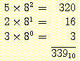 8 Áø¼ö¿¡¼ 10 Áø¼ö·Î ¹Ù²Ù´Â ¶Ç ´Ù¸¥ Áß¿äÇÑ ´Ü°è´Â 8 Áø¼öÀÇ °¢°¢¿¡ 8 ÀÇ ¸èÀÇ 10 Áø¼ö°ªÀ» °öÇϰí, ±× 10 Áø¼ö °öÀ» ´õÇÔÀ¸·Î½á ¸¸µé¾îÁø´Ù. µû¶ó¼ 5238 Àº ´ÙÀ½°ú °°ÀÌ º¯È¯µÈ´Ù.
