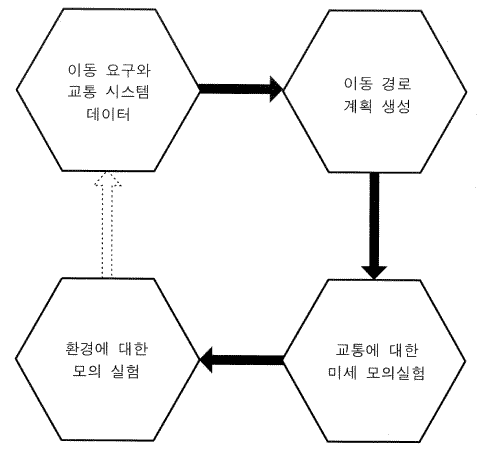 [±×¸² 1] ¿¡¼ À̵¿ ¿ä±¸ ¸ðµâ°ú ȯ°æ ¸ðÀǽÇÇè ¸ðµâ »çÀÌÀÇ Æó¼â ȸ·Î¸¦ ±¸¼ºÇÏ´Â Á¡¼±À¸·Î µÈ È»ìÇ¥¸¦ ÁÖ¸ñÇÏÀÚ. ºñ·Ï ÀÌ ¿¬°áÀÌ TRANSIMS ¸ðµ¨ÀÇ Á¤ÇüÀûÀÎ ±¸Á¶¿¡ ½ÇÁ¦·Î Æ÷ÇÔµÈ °ÍÀº ¾Æ´ÏÁö¸¸, ÀÌ ¿¬°áÀ̾߸»·Î ¹°¸®ÀûÀÎ ±³Åë¸Á°ú ÅëÇàÀÚµéÀÌ °øÅëÀûÀ¸·Î ¿ä±¸ÇÏ´Â ÀüüÀûÀ¸·Î ¾ÈÀüÇÏ°í ±ú²ýÇÑ È¯°æÀ» °¡´ÉÇÏ°Ô ÇÏ´Â ¹æ¹ýÀ» ÀüüÀûÀ¸·Î ¾ÈÀüÇÏ°í ±ú²ýÇÑ È¯°æÀ» °¡´ÉÇÏ°Ô ÇÏ´Â ¹æ¹ýÀ» ³ªÅ¸³»´Â °ÍÀ̹ǷÎ, À̰ÍÀº Ʋ¸²¾øÀÌ ½Ã½ºÅÛ¿¡ Æ÷ÇÔµÈ ½ÇÁ¦ ºÎºÐÀÌ´Ù. ÀÌÁ¦ TRANSIMS °¡ ¾î¶»°Ô µ¿ÀÛÇÏ´Â °¡¿¡ ´ëÇÏ¿© ¾Ë¾Æº¸ÀÚ.