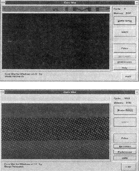 Àü¹®ÀûÀ¸·Î ¸»Çؼ, ¾Ù¹öĿŰ¾Æ °°Àº ÀΰøÀûÀÎ ¼¼°è¿¡¼ ƯÁ¤ÇÑ µ¿ÀÛµéÀÌ ¹ß»ýµÇ´Â Àå¼Ò´Â ÄÄÇ»ÅÍ ³»ºÎ¿¡ ÀÖ´Â ±â¾ïÀå¼Ò´Ù. ¸¶Âù°¡Áö·Î, ÀÌ·¯ÇÑ ¼¼°è¿¡¼ ¿¡ÀÌÀüÆ®µéÀº - ÁֽĽÃÀåÀÇ Áß°³ÀÚ È¤Àº µµ·Î ±³Åë ½Ã½ºÅÛ¿¡¼ÀÇ ¿îÀüÀÚ - ´ÜÁö ÇÁ·Î±×·¥µé¿¡ Áö³ªÁö ¾ÊÀ¸¸ç À̰͵éÀº µ¥ÀÌÅ͸¦ ³ªÅ¸³»´Â ºñÆ® (bit) µé°ú ¹ÙÀÌÆ® (byte) µéÀ» ±â¾ïÀå¼Ò À̰÷ Àú°÷À¸·Î ¿Å±èÀ¸·Î½á ¼·Î »óÈ£ÀÛ¿ëÇÑ´Ù. (¿ªÁÖ : bit ´Â binary digit ¿¡¼ À¯·¡µÈ ´Ü¾î·Î ÄÄÇ»ÅÍ¿¡¼ Á¤º¸ ÀúÀåÀÇ ÃÖ¼Ò ´ÜÀ§¸¦ ³ªÅ¸³»´Â °ÍÀ̸ç, byte ´Â 8 °³ÀÇ bit °¡ ¸ðÀÎ °ÍÀ¸·Î ¿µ¹®ÀÚ 1 °³¸¦ ÀúÀåÇÏ´Â ±âº» ´ÜÀ§ÀÌÀÚ ±â¾ïÀå¼Ò ¿ë·®ÀÇ ´ÜÀ§ÀÌ´Ù.) ÀΰøÀûÀÎ ¼¼°è¸¦ ±¸¼ºÇϴ ȯ°æ°ú ¿¡ÀÌÀüÆ®µéÀ», Àü¹®ÀûÀÎ ¿ë¾î¸¦ »ç¿ëÇÏ¿©, °¢°¢ ±â°èÀÇ ±â¾ïÀå¼Ò¿Í ÄÄÇ»ÅÍ ÇÁ·Î±×·¥À¸·Î °£ÁÖÇÏ´Â °æ¿ì, ½Ã½ºÅÛ ¼Ó¿¡¼ ¿¡ÀÌÀüÆ®µéÀÌ ¼·Î °æÀïÇÏ´Â ±×·± ¼¼°è¸¦ ¸¸µé ¼ö ÀÖ´Ù. ÀÌ·¯ÇÑ ¼¼°è Áß¿¡´Â ¹Ì±¹ÀÇ À¯¸íÇÑ °úÇÐ ÀâÁöÀÎ »çÀ̾ðƼÇÈ ¾Æ¸Þ¸®ÄÀÇ Á¤±â ±â°íÀÚ Å° µàµå´Ï (Kee Dewdney) °¡ ¹«¾ùÀΰ¡¸¦ Èä³»³»¾î ¸¸µç ÄÚ¾î¿ö (Corewar) ¶ó´Â °ÍÀÌ °¡Àå À¯¸íÇÏ´Ù.