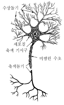 Àΰ£ÀÇ µÎ³ú´Â »ó»óÇÒ ¼ö ¾øÀ» Á¤µµ·Î ¸¹Àº ´º·± (Neuron : ½Å°æ¼¼Æ÷) µéÀÌ ¸ð¿© ÀÌ·ç¾îÁø °ÍÀ̸ç, ¿©±â¼ ´º·±µéÀº Á¶¹ÐÇÏ°Ô ¿¬°áµÈ ¿¬°á¸ÁÀ» ÅëÇÏ¿© ¼·Î Á¤º¸¸¦ ±³È¯ÇÑ´Ù. ÀÌ·± ¿¬°á¸Á¿¡¼ "¿¬°á¼±" Àº Ãà»öµ¹±â (axon) ¿Í ¼ö»óµ¹±â (dendrite) ¶ó ºÎ¸£°í, ÇÑ ´º·±°ú ´Ù¸¥ ´º·±°úÀÇ ¿¬°áÁ¡À» ½Ã³À½º (synapse) ȤÀº ¿¬Á¢À̶ó ºÎ¸¥´Ù. ¼ö»óµ¹±âµéÀº ½Å°æ¸Á ³» ´Ù¸¥ ´º·±¿¡¼ ¹ß»ýµÈ Àü±âÈÇÐÀû ½ÅÈ£°¡ Èê·¯ µé¾î¿À´Â ÀÔ·Â Åë·Î´Ù. ÀÌ·¸°Ô ÀÔ·ÂµÈ ½ÅÈ£µé Áß¿¡¼ ÀϺδ ÈïºÐ¼º ½ÅÈ£µéÀ̰í, ´Ù¸¥ ÀϺδ ¾ïÁ¦¼º ½ÅÈ£µéÀÌ´Ù. ¸¸ÀÏ ÈïºÐ¼º ½ÅÈ£¿Í ¾ïÁ¦¼º ½ÅÈ£ °³¼öÀÇ Â÷À̰¡ Á¤ÇØÁø ¹®ÅΰªÀ» ³Ñ¾î¼¸é, ÀÌ ´º·±Àº Ãà»öµ¹±â¸¦ µû¶ó Èê·¯³ª°¡´Â ½ÅÈ£¸¦ ¹ß»çÇÑ´Ù. ÀÌ·¸°Ô Ãâ·ÂµÈ ½ÅÈ£´Â ÈïºÐ¼º ȤÀº ¾ïÁ¦¼º ÀÔ·ÂÀ¸·Î ´Ù¸¥ ´º·±ÀÇ ÀÔ·ÂÀ¸·Î ÀÛ¿ëÇÑ´Ù. [±×¸² 11] Àº ´º·±ÀÇ ÀüÇüÀûÀÎ ±¸Á¶¸¦ ³ªÅ¸³½´Ù.