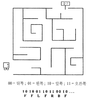 ·Îº¿ÀÇ À̵¿ °æ·Î 20 ´Ü°è´Â ±âÈ£ B, F, R, ¹× L ·Î ±¸¼ºµÈ ±æÀ̰¡ 20 ÀÎ ¹®ÀÚ¿·Î Ç¥ÇöµÈ´Ù. °¢ ±âÈ£´Â µÎÀÚ¸® ÀÌÁø¼ö·Î ºÎȣȵDZ⠶§¹®¿¡ °á±¹ 20 ´Ü°è À̵¿ °æ·Î´Â 40 ºñÆ® ±æÀÌÀÇ ÀÌÁø¼ö¿·Î ³ªÅ¸³¾ ¼ö ÀÖ´Ù. [±×¸² 17] ¿¡ ÀÌ·¯ÇÑ ÀÌÁø¼ö¿ ÀϺΰ¡ ³ªÅ¸³ª ÀÖ´Ù. ÀÌ ÀÌÁø¼ö¿Àº ¸ðÁý´Ü¿¡ ¼ÓÇÑ °¢°¢ÀÇ "°³Ã¼ (organisms)" µéÀ» ³ªÅ¸³»´Â "À¯ÀüÀÚÇü (genotypes)" À¸·Î °£ÁÖÇÒ ¼ö ÀÖÀ¸¸ç, °¢ °³Ã¼°¡ °®°í ÀÖ´Â À¯ÀüÀÚÇüÀº ±× °³Ã¼°¡ ¹Ì·Î ¼Ó¿¡¼ ¾î¶»°Ô À̵¿Çϴ°¡¸¦ ³ªÅ¸³»´Â °ÍÀÌ´Ù. °¢°¢ÀÇ °³Ã¼µéÀº ¾î¶² °ÍÀÌ ·Îº¿À» ÀÔ±¸¿¡¼ Ãⱸ±îÁö °¡Àå È¿°úÀûÀ¸·Î À̵¿½ÃŰ´Â ¹æ¹ýÀ» Ç¥ÇöÇϴ°¡¸¦ ³õ°í ¼·Î °æÀïÇÑ´Ù. ¸ðµç °³Ã¼ÀÇ ÀûÇÕµµ´Â, ÀÏ´Ü ·Îº¿À» ¹Ì·ÎÀÇ ÀÔ±¸¿¡ °®´Ù ³õ°í °¢ °³Ã¼ÀÇ À¯ÀüÀÚÇü¿¡ µû¶ó 20 ´Ü°è¸¦ À̵¿ÇÏ°Ô ÇÑ ÈÄ, ÃÖÁ¾ À§Ä¡¿¡¼ Ãⱸ±îÁö À̵¿Çϱâ À§ÇÏ¿© ÇÊ¿äÇÑ ³²Àº ´Ü°èÀÇ ¼ö¸¦ °è»êÇÏ¿© Á¤ÇÑ´Ù. ÀÌ °ªÀÌ ÀÛÀ¸¸é ÀÛÀ»¼ö·Ï, °³Ã¼ÀÇ ÀûÇÕµµ´Â ´õ Ä¿Áø´Ù. ·Îº¿ÀÌ 20 ´Ü°è ÀÌÀü¿¡ Ãⱸ¿¡ µµ´ÞÇϵµ·Ï ÇÏ´Â ¸ðµç °³Ã¼ÀÇ ÀûÇÕµµ´Â ÃÖ´ëÀûÇÕµµ 0 ÀÌ´Ù. ±×·¸´Ù¸é ±×·± ÃÖÀûÀÇ ÀûÇÕµµ¸¦ °®´Â ÀÌÁø¼ö¿À» ¾î¶»°Ô ã¾Æ³¾ ¼ö ÀÖÀ»±î? °¡´ÉÇÑ À¯ÀüÀÚÇü °ø°£¿¡¼ ±×·¸°Ô ³ôÀº ÀûÇÕµµ¸¦ °®´Â °³Ã¼¸¦ ã¾Æ³»´Â ÀýÂ÷¸¦ ¸¸µé¾î³¿À¸·Î½á, ¿ì¸®´Â ÀÚ¿¬ÀÌ ÇàÇÏ´Â °Í°ú µ¿ÀÏÇÑ ¹æ¹ýÀ¸·Î ±×·¯ÇÑ ÀÌÁø¼ö¿À» ã¾Æ³¾ ¼ö ÀÖ´Ù. ±× ÀýÂ÷°¡ ¹Ù·Î À¯ÀüÀÚ ¾Ë°í¸®Áò (GA) ÀÌ´Ù. À¯ÀüÀÚ ¾Ë°í¸®ÁòÀÇ ÇÙ½ÉÀûÀÎ ±¸¼º¿ä¼Ò´Â µ¹¿¬º¯ÀÌ, À¯ÀüÀÚ ±³Â÷, ¹× ¼±ÅÃÀ̶ó´Â Ãß»óÈµÈ ÀÚ¿¬ÀÇ ÀýÂ÷´Ù. ±âº»ÀûÀ¸·Î, ¿ì¼±Àº ±âÁ¸ÀÇ À¯ÀüÀÚÇüÀ¸·ÎºÎÅÍ »õ·Î¿î À¯ÀüÀÚÇüÀ» ¸¸µå´Â ¹æ¹ýÀÌ ÇÊ¿äÇϰí, ´ÙÀ½À¸·Î ¸ðÁý´Ü¿¡ ¼ÓÇÑ ¸ðµç À¯ÀüÀÚÇüµéÀÇ »ó´ëÀûÀÎ ÀûÇÕµµ¸¦ °è»êÇÒ ¼ö ÀÖ¾î¾ß ÇÑ´Ù. ¾Õ¼ ¾ð±ÞÇß´ø °Íó·³, ±âÁ¸ÀÇ À¯ÀüÀÚÇüÀ» º¯ÇüÇÏ¿© »õ·Î¿î À¯ÀüÀÚÇüÀ» ¸¸µå´Â ¹æ¹ýÀº ´ÙÀ½°ú °°Àº µÎ °¡Áö°¡ ÀÖ´Ù.