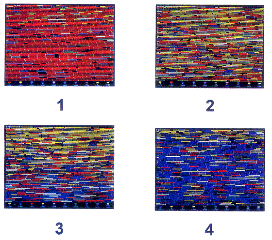 [±×¸² 18] Àº ¼÷ÁÖ Áý´Ü°ú ±â»ýÃæ Áý´Ü »çÀÌ¿¡¼ ¹ú¾îÁö´Â ÁøÈÀû ±ººñ °æÀïÀ» º¸¿©ÁÖ´Â °ÍÀ¸·Î, °¢°¢ÀÇ ±×¸²Àº 60,000 ¹ÙÀÌÆ® Å©±âÀÇ ¼öÇÁ¸¦ 1,000 ¹ÙÀÌÆ® Å©±â¸¦ °®´Â 60 °³ ±¸°£À¸·Î ³ª´« °æ¿ìÀÇ ÄÄÇ»ÅÍ ±â¾ïÀå¼Ò Áöµµ¸¦ ³ªÅ¸³»´Â °ÍÀÌ´Ù. ÁÂÃø »ó´Ü ±×¸²ÀÇ °æ¿ì ´ëºÎºÐÀº ¼÷ÁÖ (ºÓÀº»ö) µéÀÌ°í ±â»ýÃæ (³ë¶õ»ö) µéÀº ÀÌÁ¦ ¸· ÃâÇöÇϱ⠽ÃÀÛÇÑ´Ù. ¿ìÃø »ó´ÜÀÇ ±×¸²¿¡¼´Â ÀÌÁ¦ ±â»ýÃæµéÀÌ ´ëºÎºÐÀÇ ¿µ¿ªÀ» Â÷ÁöÇϰí ÀÖÀ¸¸ç µå¹°°Ô ¼÷ÁÖµéÀ» ¹ß°ßÇÒ ¼ö ÀÖ´Ù. ±×¸®°í ºñ·Ï µå¹°±â´Â ÇÏÁö¸¸ ±â»ýÃæ¿¡ ¸é¿ªÀÌ »ý±ä ¼÷ÁÖ (ÆÄ¶õ»ö) µéÀÌ ÃâÇöÇϱ⠽ÃÀÛÇÑ´Ù. ÁÂÃø ÇÏ´ÜÀÇ ±×¸²À» º¸¸é ¸é¿ªÀÌ µÈ ¼÷ÁÖµéÀÌ ±â»ýÃæµéÀ» ±â¾ïÀå¼Ò À§ÂÊÀ¸·Î ¸ô¾Æ³»°í ±â¾ïÀå¼ÒÀÇ »ó´ç ºÎºÐÀ» Â÷ÁöÇϰí ÀÖÀ½À» ¾Ë ¼ö ÀÖ´Ù. ¸¶Áö¸·À¸·Î ¿ìÃø ÇÏ´ÜÀÇ ±×¸²À» º¸¸é, ¸é¿ªÀÌ µÈ ¼÷ÁÖµéÀÌ °Å´ë ¸ðÁý´ÜÀ¸·Î ±¸¼ºÇÑ ¹Ý¸é¿¡ ±â»ýÃæÀ̳ª ÀǽÉÀÌ °¡´Â ¼÷ÁÖµéÀÌ ¸¹ÀÌ »ç¶óÁ® ¹ö·ÈÀ½À» ¾Ë ¼ö ÀÖ´Ù. ÇöÀçÀÇ ±â»ýÃæµéÀº ¸ÓÁö ¾Ê¾Æ ¸êÁ¾µÇ¾î ¹ö¸± °ÍÀÌ´Ù.