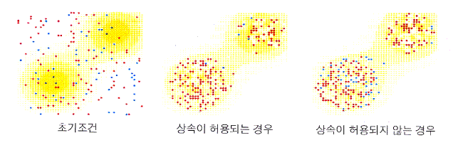 ÀÌ·¯ÇÑ ±âº»ÀûÀÎ ±ÔÄ¢µé¸¸À» »ç¿ëÇÏ´õ¶óµµ, ÀÌ»óÇÏ°í ¾ß¸©ÇÑ ÀϵéÀÌ ÀϾ±â ½ÃÀÛÇÑ´Ù. ´ÙÀ½ [±×¸² 19] ´Â ´ëÇ¥ÀûÀÎ ½Ã³ª¸®¿À¸¦ º¸¿©ÁÖ´Â °ÍÀ¸·Î, ¿©±â¼ ¼³ÅÁÀº ½´°Å½ºÄÉÀÌÇÁ À§¿¡ ³ë¶õ»öÀ¸·Î Ç¥½ÃµÈ °ÍµéÀÌ´Ù. ½ÃÀ۴ܰ迡 ¿¡ÀÌÀüÆ®µéÀº dz°æ À§¿¡ ¹«ÀÛÀ§ ÀûÀ¸·Î ºÐ»êµÇ´Âµ¥, ºÓÀº»ö Á¡µéÀº ¸Ö¸® ¶³¾îÁø °÷¿¡¼µµ ¸ÔÀ̸¦ Àß ¹ß°ßÇÒ ¼ö ÀÖ´Â ¿¡ÀÌÀüÆ®µéÀ» ³ªÅ¸³»°í ÀÖÀ¸¸ç, Ǫ¸¥»ö Á¡µéÀº ±Ù½ÃÀûÀÎ °³Ã¼µéÀ» ³ªÅ¸³»°í ÀÖ´Ù. ´Ù¸¥ °í·Á»çÇ×ÀÌ ÁÖ¾îÁöÁö ¾Ê´Â´Ù¸é ÀÚ¿¬ ¼±ÅÃÀÌ ½Ã°£ÀÌ °æ°úÇÏ¸é¼ ´õ Àß º¸´Â ÂÊ¿¡ ¿ìÈ£ÀûÀ¸·Î ÀÛ¿ëÇÒ °ÍÀ¸·Î ¿¹»óÇÏ´Â °ÍÀº ¾ÆÁÖ ÇÕ¸®ÀûÀÎ ÆÇ´ÜÀÌ´Ù. ¸ðÁý´Ü ³»¿¡ ºÓÀº»ö ¿¡ÀÌÀüÆ®µéÀÌ ¿ìÀ§¸¦ Â÷ÁöÇϰí ÀÖ´Â °¡¿îµ¥ ±×¸²¿¡¼ º¼ ¼ö ÀÖµíÀÌ ½ÇÁ¦·Î ±×·¸´Ù. ±×·¯³ª ¿¡ÀÌÀüÆ®µé¿¡°Ô ¼³ÅÁÀ̶ó´Â Àç»êÀ» ÀÚ½ÅÀÇ Àڼյ鿡°Ô ³Ñ°ÜÁÙ ¼ö ÀÖ´Â ´É·ÂÀ» ºÎ¿©ÇÏ°í ½ÇÇèÀ» ´Ù½Ã ¼öÇàÇϸé, »ó¼ÓÀ̶ó´Â °ÍÀÌ »ýÁ¸¿¡ µÎµå·¯Áö°Ô ¿µÇâÀ» Áشٴ °ÍÀ» ¹ß°ßÇÒ ¼ö ÀÖ´Ù. ¼¼ ¹øÂ° ±×¸²¿¡ À̰ÍÀÌ Àß ³ªÅ¸³ª ÀÖ´Ù.