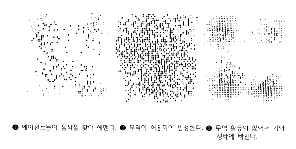 ºñ·Ï ÀÌ °£´ÜÇÑ ¿¹°¡ ÄÄÇ»Å׶󸮿òÀÇ µ¿ÀÛÀ» Àß º¸¿©ÁÖ±â´Â ÇÏÁö¸¸, »çȸ ±¸Á¶¸¦ ¿¬±¸ÇÏ°í ±×°Í¿¡ ´ëÇÏ¿© »ý°¢ÇÏ´Â ¹æ½Ä¿¡ ¾î¶² Çõ½ÅÀ» ÁÖÁö´Â ¾Ê´Â´Ù. ±×·¸±â ¶§¹®¿¡ ½Ã½ºÅÛ¿¡ ´õ ¸¹Àº È£°¢°ú ¹æ¿ïÀ» Ãß°¡ÇÒ Çʿ䰡 ÀÖ´Ù. ¿¦½ºÅ¸Àΰú ¿¢½ºÅÚÀº À̰ÍÀ» Á¤È®ÇÏ°Ô ½ÇÇàÇÏ¿´´Ù. ±×µéÀÌ ¾ç³äÀ» Ãß°¡ÇÏ¿© ¼³ÅÁÀÇ ³óµµ°¡ ½Ã°£¿¡ µû¶ó ÁÖ±âÀûÀ¸·Î º¯ÇÏ°Ô ÇÏÀÚ, ¿¡ÀÌÀüÆ®µéÀÌ ´Ù¸¥ °÷À¸·Î ÀÌÁÖÇϱ⠽ÃÀÛÇÏ¿´´Ù. ±×¸®°í µÎ ¹øÂ° ¾ç³äÀÌ Ãß°¡µÇ¾úÀ» ¶§´Â Ãʱâ ÇüÅÂÀÇ ÇüÁ¦°¡ ÃâÇöÇÏ¿´´Ù. Ãß°¡µÈ ¾ç³äÀº ´ÙÀ½°ú °°Àº »õ·Î¿î ±âº» ±ÔÄ¢À» °¡´ÉÇÏ°Ô ÇÑ´Ù : "³ª¿¡°Ô ÇÊ¿äÇÑ ¹°ÀÚ¸¦ °¡Áö°í ÀÖ´Â ÀÌ¿ôÀ» ã´Â´Ù. ¼·Î ¸¸Á·ÇÒ ¸¸ÇÑ °¡°Ý¿¡ µµ´ÞÇÒ ¶§±îÁö ÀÌ¿ô°ú ÈïÁ¤À» ÇÑ´Ù. ±×¸®°í ±× °¡°ÝÀ¸·Î °Å·¡¸¦ ÇÑ´Ù." [±×¸² 20] Àº ÀÌ·¯ÇÑ À¯ÇüÀÇ ¹«¿ª °æÁ¦¸¦ º¸¿©ÁØ´Ù. ù ¹øÂ° ±×¸²¿¡¼, ¿¡ÀÌÀüÆ®µéÀº ¼³ÅÁ°ú ¾ç³äÀ» °¡¸®Áö ¾Ê°í ´Ü¼øÇÏ°Ô À̸®Àú¸® Çì¸Å¸ç ¸ÔÀ̸¦ ã°í ÀÖ´Ù. µÎ ¹øÂ° ±×¸²¿¡¼´Â ¹«¿ªÀÌ ½ÃÀÛµÊÀ¸·Î½á ¹ß»ýÇÑ È¿°ú¸¦ º¼ ¼ö ÀÖ´Ù : ¸¹Àº ¿¡ÀÌÀüÆ®µéÀÌ ¹ø¼ºÇϰí ÀÖ´Ù. ¸¶Áö¸·À¸·Î, ¼¼ ¹øÂ° ±×¸²Àº ¹«¿ªÀÌ Áß´ÜµÈ È¿°ú¸¦ ³ªÅ¸³»°í ÀÖ´Ù. ¹«¿ªÀÌ Çã¿ëµÇÁö ¾Ê¾ÒÀ» ¶§, ¸¹Àº ¿¡ÀÌÀüÆ®µéÀÌ »ýÁ¸ÇÒ ¼ö ¾ø¾ú´Ù. ¾ÆÁÖ ³î¶ø°Ôµµ, ÀÌ·± ±âÃÊÀûÀÎ ±³È¯-¹æ½Ä °æÁ¦°¡ ¸ðµç °æÁ¦Çп¡¼ °¡Àå ½ÅºÀµÇ´Â ÀÌ·ÐÀÎ È¿À²ÀûÀÎ ½ÃÀå °¡¼³À» Æò°¡ÇÏ´Â ½ÇÇèÀ» ¼öÇàÇϱ⿡ ÃæºÐÇÑ ±¸Á¶¸¦ Á¦°øÇÑ´Ù.