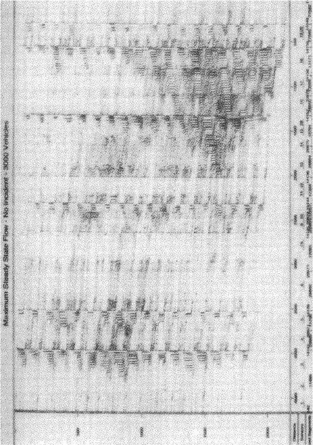 ¿ì¸®´Â ÀÌ ÁÖÁ¦¸¦ Åä¿äÀÏ ¿ÀÈÄ Å©¸®½º¸¶½º ¼±¹°À» »ç·Á´Â »ç¶÷µé¿¡ ÀÇÇÏ¿© ¹ß»ýÇÏ´Â ·çÀÌÁö¾Ö³ª °Å¸®ÀÇ ±³Åë ´ë¶õÀ̶ó´Â ½½Ç À̾߱⸦ °¡Áö°í ½ÃÀÛÇß´Ù. ÀÌ·¸µí ¿ì¿ïÇÑ »óȲ¿¡ ´ëÇÏ¿© ¿ì¸®°¡ ´øÁú ¼ö ÀÖ´Â Áú¹®Àº ¸í¹éÇÏ°Ô ´ÙÀ½°ú °°Àº °ÍÀÌ´Ù. °Å¸®°¡ ¿ÏÀüÇÑ Á¤Ã¼ »óÅ¿¡ µµ´ÞÇϱâ Àü¿¡ µÎ »óÁ¡À» ¿¬°áÇÏ´Â µµ·Î¿¡ ½Ã°£´ç ¸î ´ëÀÇ Â÷·®ÀÌ À¯ÀÔµÇ¸é µÉ±î? TRANSIMS ¸¦ ÀÌ¿ëÇÏ¿© µµ·Î·Î À¯ÀԵǴ Â÷·®À» Á¶ÀýÇÏ°í °á°ú¸¦ °üÂûÇÔÀ¸·Î½á, ¿ì¸®´Â ÀÌ Áú¹®¿¡ ´ëÇÑ ´äÀ» ¾ÆÁÖ ½±°Ô ¾òÀ» ¼ö ÀÖ´Ù. [±×¸² 8] Àº 30 ºÐ¸¶´Ù 3000 ´ëÀÇ Â÷·®ÀÌ µÎ »óÁ¡À» ¿¬°áÇÏ´Â µµ·Î¿¡ À¯ÀԵǴ °æ¿ì¿¡ ´ëÇÑ ½Ã°ø°£ È帧µµ¸¦ ³ªÅ¸³½´Ù. ÀÌ ±×¸²Àº ´ÙÀ½°ú °°ÀÌ º¸¾Æ¾ß ÇÑ´Ù. Â÷·®Àº ±×¸²ÀÇ ¿ÞÂÊ À§¿¡¼ºÎÅÍ À¯ÀԵȴÙ. ½Ã°£ÀÇ °æ°ú´Â ¼öÁ÷ÃàÀ» µû¶ó¼ ¾Æ·¡ÂÊÀ¸·Î ÁøÇàµÇ´Â ¹Ý¸é¿¡ ¼öÆòÃàÀº ¿ÞÂÊ¿¡¼ ¿À¸¥ÂÊÀ¸·Î µÎ »óÁ¡À» ÀÕ´Â µµ·ÎÀÇ À§Ä¡¸¦ ³ªÅ¸³½´Ù. µû¶ó¼, Â÷·®ÀÌ µµ·Î¿¡ ÁøÀÔÇϰí ÀÏÁ¤ÇÑ ¼Óµµ·Î ¾ÕÀ¸·Î À̵¿ÇÏ´Â °Í¿¡ ´ëÇÑ ½Ã°ø°£ ±ËÀûÀº ¿ÞÂÊ À§¿¡¼ ¿À¸¥ÂÊ ¾Æ·¡·Î À̾îÁö´Â ´ë°¢ ¼±ºÐÀ¸·Î Ç¥½ÃµÇ¸ç, ÀÌ ¼±ºÐ¿¡ ´ëÇÑ ±â¿ï±â¿¡ À½ÀÇ ºÎÈ£¸¦ ÃëÇϸé Â÷·® ¼ÓµµÀÇ ¿ª¼ö°¡ µÈ´Ù. ÇÑÆí, µµ·Î¿¡ À¯ÀÔµÈ Â÷·®ÀÌ ±³Åë Á¤Ã¼¿¡ ÀÇÇÏ¿© ¸ØÃß¾î ÀÖ´Â ±â°£Àº ÀÚ½ÅÀÇ °æ·Î¿¡ ¼öÁ÷ ¹æÇâÀÇ ¼±ºÐ Á¶°¢ÀÌ Æ÷ÇԵǴ °ÍÀ¸·Î Ç¥½ÃµÈ´Ù. À̰ÍÀº ÀÌ·¯ÇÑ Â÷·®ÀÇ À̵¿¿¡´Â ½Ã°£ÀÌ °æ°úµÇ¾úÀ½¿¡µµ Â÷·®ÀÌ ¾ÕÀ¸·Î ÁøÇàÇÏÁö ¸øÇÑ ±â°£ÀÌ Àֱ⠶§¹®ÀÌ´Ù (¿ªÁÖ : µû¶ó¼, ±â¿ï±â°¡ ¿Ï¸¸ÇÒ¼ö·Ï ±× ±¸°£À» ºü¸£°Ô Åë°úÇßÀ½À» ³ªÅ¸³»°í, ±×·¯´Ù°¡ ¼öÁ÷À¸·Î ¼±ÀÌ ³»·Á°¡¸é ±× ±â°£µ¿¾È Á¤Ã¼·Î ÀÎÇÏ¿© ¸ØÃß¾î ¼± °ÍÀ» ³ªÅ¸³½´Ù).
