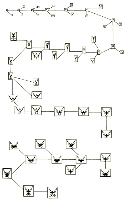 ÀÓÀÇ·Î »ý¼ºµÈ °Ô³ð (°³Ã¼¸¦ ³ªÅ¸³»´Â À¯ÀüÇü) ¿¡¼ Ãâ¹ßÇÏ¿© ±×°Í¿¡ ´Ù¾çÇÑ À¯ÇüÀÇ µ¹¿¬º¯À̸¦ Àû¿ëÇϰí, ±×°Íµé Áß¿¡¼ ´ÙÀ½ ¼¼´ë¿¡ »ýÁ¸ÇÒ µ¹¿¬º¯ÀÌü¸¦ ½É½º´Â ½º½º·Î ¼±ÅÃÇÏ¿´´Ù. Áï, ÀÚ¿¬ÀÇ ¿ªÇÒÀ» ½É½º°¡ ´ã´çÇÑ °ÍÀÌ´Ù. ±×·¯ÇÑ ´Ü¼øÇÑ °úÁ¤À» 5 ³»Áö 20 ȸ ¹Ýº¹ÇÑ ÈÄ¿¡´Â ³î¶ö¸¸ÇÑ ±×¸²µéÀÌ ÃâÇöÇÑ´Ù. ±×¸² 15 (a-c) ´Â ½É½ºÀÇ ÀÛǰÁý ÁßÀÇ ÀϺθ¦ ´ëÀÀµÇ´Â LISP À¯ÀüÇü°ú ÇÔ²² ³ªÅ¸³½ °ÍÀÌ´Ù. ±×¸² (c) ÀÇ °æ¿ì ½É½º°¡ ÀÚ½ÅÀÇ ÇÁ·Î±×·¥¿¡ À¯ÀüÇüÀ» ÀúÀåÇÏ´Â ºÎºÐÀ» Æ÷ÇÔ½Ã۱â ÀÌÀü¿¡ ¸¸µç °ÍÀ̱⿡ À¯ÀüÇüÀÌ ³ªÅ¸³ª ÀÖÁö ¾Ê´Ù. µû¶ó¼ ÀÌ ±×¸²ÀÇ °æ¿ì ¿ì¸®´Â ±×°ÍÀ» ÁøÈ¿¡ ÀÇÇÑ ¿¹¼ú ¼¼°è¿¡¼ ¸êÁ¾µÈ °ÍÀ¸·Î (¿ªÁÖ : Áï, ¸êÁ¾µÇ¾î ´õ ÀÌ»ó À¯ÀüÀÚ¸¦ äÃëÇÒ ¼ö ¾ø´Â °ÍÀ¸·Î) °£ÁÖÇÒ ¼ö ÀÖ´Ù. ¾îÂî µÇ¾ú°Å³ª ÀÌÁ¦ ¿ì¸®´Â ±×¸² (b) ¿Í °°Àº º¹ÀâÇÑ ¿¹¼ú ÀÛǰÀÌ ¾î¶»°Ô 186 °³ÀÇ ¾ËÆÄºªÀ¸·Î »ý¼ºµÇ¾ú´Â°¡¸¦ ÁÖ¸ñÇØ¾ß ÇÑ´Ù. ¿ì¸®´Â ´ÙÀ½ Àå¿¡¼ ½Ã½ºÅÛÀÇ º¹À⼺¿¡ ´ëÇÏ¿© º¸´Ù »ó¼¼ÇÏ°Ô ³íÀÇÇÒ °ÍÀÌ´Ù.
