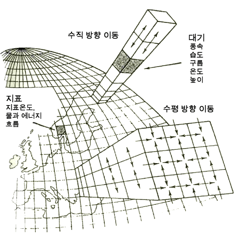 ±â»ó ¿¹Ãø¿¡´Â ÀÏ¹Ý ¼øÈ¯ ¸ðµ¨ (GCM : general circulation model) À̶ó ºÎ¸£´Â ¸ðµ¨ÀÌ ÀϹÝÀûÀ¸·Î »ç¿ëµÈ´Ù. ÀÌ ¸ðµ¨Àº ±×¸² 10 °ú °°ÀÌ 3 Â÷¿ø °ÝÀÚ¸¦ »ç¿ëÇϸç, °¢ °ÝÀÚ »çÀÌÀÇ °ü°è¸¦ ³ªÅ¸³»´Â ¸Å¿ì Á¤±³ÇÑ °ü°è½ÄÀ» »ç¿ëÇÑ´Ù. GCM ¿¡¼ »ç¿ëµÇ´Â °ü°è½ÄÀº ´ÙÀ½°ú °°´Ù.