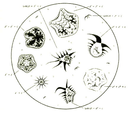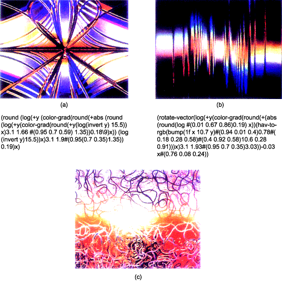 ¼ö³â Àü, ÄÄÇ»ÅÍ °úÇÐÀÚ Ä® ½É½º (Karl Sims) ´Â LISP ÇÁ·Î±×·¡¹Ö ¾ð¾î (¿ªÁÖ : LISP Àº List processing ¿¡¼ ³ª¿Â °ÍÀ¸·Î, ±âÈ£ 󸮸¦ À§ÇÑ ´ëÇ¥ÀûÀÎ ÀΰøÁö´É ÇÁ·Î±×·¡¹Ö ¾ð¾îÀ̸ç, LISP ¾ð¾î¿¡¼´Â ¹®ÀåÀ» Ç¥Çö½ÄÀ̶ó ºÎ¸¥´Ù. ¿©±â¿¡ ´ëÀÀµÇ´Â °ÍÀ¸·Î ³í¸®Àû Ãß·ÐÀ» À§ÇÑ Prolog ¶ó´Â ÀΰøÁö´É ÇÁ·Î±×·¡¹Ö ¾ð¾î°¡ ÀÖ´Ù.) ¿¡¼ÀÇ Ç¥Çö½ÄÀ» ÁøÈÀû ÀýÂ÷ÀÇ À¯ÀüÇüÀ¸·Î Ãë±ÞÇÏÀÚ´Â »ý°¢À» ÇÏ°Ô µÇ¾ú´Ù. ±×¸®°í ±×°ÍÀÌ ÄÄÇ»Å͸¦ ÅëÇÏ¿© ½ÇÇàµÉ ¶§, ½ÇÇàÀÇ °á°ú¸¦ LISP Ç¥Çö½Ä¿¡ ÀÇÇÏ¿© »ý¼ºµÈ Ç¥ÇöÇüÀ¸·Î °£ÁÖÇÏ¿´´Ù. ½É½ºÀÇ Àǵµ´Â ÀÌ·¯ÇÑ ±âÈ£ Ç¥Çö½ÄÀ» ÀÌ¿ëÇÑ ÁøÈÀû ÀýÂ÷¸¦ ¸¸µå´Â °ÍÀ̾ú´Ù. ±×ÀÇ ¿¡»óÀº ÀûÁßÇÏ¿© LISP Ç¥Çö½ÄÀº ÇÁ·Î±×·¡¸Ó°¡ ±× ½ÄÀÇ °á°ú°¡ ±×·¯Çϸ®¶ó°í »ó»óÇÑ ÇѰ踦 ¶Ù¾î³Ñ´Â ÁøÁ¤ »õ·Î¿î ¹ß»ý ±ÔÄ¢À̳ª ¸Å°³º¯¼ö °ªÀ» ÃâÇö½Ãų °¡´É¼ºÀ» Á¦°øÇÑ´Ù. ¿©±â¼ ÇÁ·Î±×·¡¹Ö ¾ð¾î ¹®ÀåÀ¸·Î¼ Ç¥Çö½ÄÀÌ °®´Â Á¤È®ÇÑ Àǹ̴ ´õ ÀÌ»ó Áß¿äÇÑ °ÍÀÌ ¾Æ´Ï¸ç, ±×°ÍµéÀº ´ÜÁö ƯÁ¤ÇÑ °ªÀ» ÀÔ·ÂÀ¸·Î ¹Þ¾Æ Èæ¹é ȤÀº ÀÚ¿¬»ö ¿µ»óÀ» °á°ú·Î Ãâ·ÂÇÏ´Â °ÍÀ¸·Î¼ Àǹ̸¦ °®´Â´Ù. ÀÌÁ¦ ½É½º°¡ ´ÜÁö ÀÚ½ÅÀÇ »ý°¢À» È®ÀÎÇϱâ À§ÇÏ¿© »ç¿ëÇÑ ¸î °¡Áö Ç¥Çö½ÄÀÇ ¿¹¸¦ »ìÆìº¸µµ·Ï ÇÏÀÚ.
