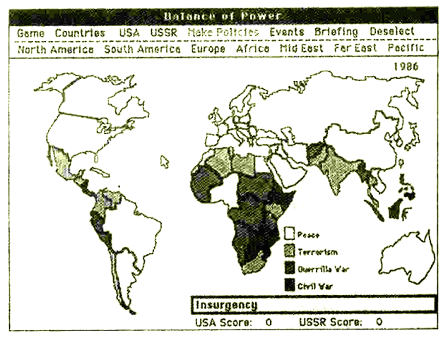 °ÔÀ̸Ӱ¡ ¾î¶² ÇൿÀ» ÃëÇÒ °ÍÀΰ¡¸¦ °áÁ¤Çϰí, »ó´ë¹æÀÌ ÃëÇÒ ¼ö ÀÖ´Â ¹ÝÀÀÀ» ¾Ë¾Æ³»´Â °ÍÀ» µ½±â À§Çؼ ÀÌ °ÔÀÓÀº ´ë´ÜÈ÷ ¸¹Àº Áöµµ¿Í °æÁ¦, »çȸ, Á¤Ä¡, ¹× ±º»ç¿¡ ´ëÇÑ µ¥ÀÌÅͺ£À̽º¸¦ Á¦°øÇÑ´Ù. ±×¸² 16 Àº ±×·¯ÇÑ ½Ã°¢Àû µµ¿òÀÇ ¿¹·Î½á, ƯÁ¤ ½ÃÁ¡ (ÀÌ °æ¿ì´Â 1986 ³â) ¿¡ Àü ¼¼°è¿¡¼ ¹ß»ýµÈ ´Ù¾çÇÑ À¯ÇüÀÇ ¹«Àå ¹Ý¶õÀ» ³ªÅ¸³»´Â Áöµµ´Ù. ÀÌ·¯ÇÑ Á¤º¸ÀÇ ¸ðÀÓÀº ¼¼»ó¿¡ ´ëÇÑ °£°áÇÑ ½º³À »çÁøÀÎ ¼ÀÀÌ´Ù. Áï, ¼¼»óÀÇ ³ª¶ó¸¦ Ư¼º Áþ´Â ¹«Àå Æøµ¿, ±¹³» Á¤¼¼, ¿Ü±³ ³ë¼±, ¹× ¸¹Àº ´Ù¸¥ ¿ä¼ÒµéÀ» Á¦°øÇÑ´Ù. ÀÌ °ÔÀÓÀº ÀÌ·¯ÇÑ Á¤º¸¸¦ Á¦°øÇÔÀ¸·Î¼, Áö¸® Á¤Ä¡ÀûÀÎ Àǻ縦 °áÁ¤Çϴµ¥ ÇÊ¿äÇÑ Å¸ÇùÀÇ º»ÁúÀ» ȹµæÇϱ⿡´Â ÃæºÐÈ÷ º¹ÀâÇÏÁö¸¸, Áý¿¡¼ Àû´çÇÑ ½Ã°£¾È¿¡ Áñ±â±â¿¡´Â ÃæºÐÈ÷ °£°áÇÑ Àý¹¦ÇÏ°Ô ÀýÃæµÈ ¸ðÀǽÇÇèÀ» °¡´ÉÇÏ°Ô ÇÑ´Ù.