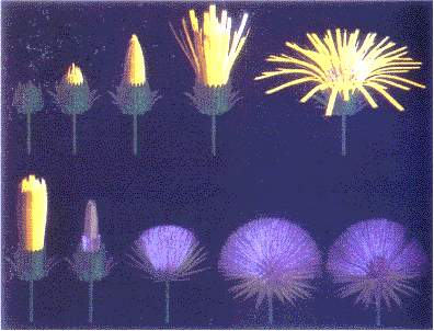 ¾Æ´Ï¹è³ª°¡ ½Ä¹°ÀÎ °ÍÀº ºÐ¸íÇÏÁö¸¸, °¡Àå ¿ø½ÃÀûÀÎ ½Ä¹°ÀÌ´Ù. °Ô´Ù°¡ ±×¸² 5 ¿¡ ³ª¿ÍÀÖ´Â ÀÌ ½Ä¹°ÀÇ ¸ð¾çÀº ½ÇÁ¦ÀÇ ±×°Í°ú´Â ´Ù¸¥, ¸¶Ä¡ ¸ðÇü ÆÇÁö¿¡¼ ¶â¾î³½ °Í°ú ºñ½ÁÇÑ °ÍÀ¸·Î, ÀÌ Ã»³ì Á¶·ùÀÇ ¼ºÀå¿¡ ´ëÇÑ °¡Àå ±âº»ÀûÀΠƯ¡À» º¸¿©ÁÖ´Â ´Ü¼øÇÑ 2 Â÷¿ø ¸ðµ¨¿¡ Áö³ªÁö ¾Ê´Â´Ù. ±×·¯³ª ½Ä¹°ÀÇ ¼ºÀåÀ» ´Ü¼øÇÑ ±ÔÄ¢ÀÇ ÁýÇÕ Áï, L-½Ã½ºÅÛÀ¸·Î ³ªÅ¸³½´Ù´Â ±âº»ÀûÀÎ »ý°¢Àº ÇöÀç´Â ³Î¸® »ç¿ëµÇ´Â °ÍÀ̸ç, ¸°µ§¸¶À̾îÀÇ µ¿·áµé ƯÈ÷ Ǫ¸£ÁøÅ°ºêÁî (P. Prusinkiewicz) ¿¡ ÀÇÇÏ¿© ±ØÀûÀÎ ¼º°úµéÀÌ ³ªÅ¸³ª°Ô µÇ¾ú´Ù. ¿©±â¿¡¼ ±×°ÍÀ» ÀÚ¼¼ÇÏ°Ô ¼³¸íÇÏÁö´Â ¾Ê°ÚÁö¸¸, ±×¸² 6 À» º¸¸é, L-½Ã½ºÅÛ ±ÔÄ¢µéÀÌ ½Ä¹°ÀÇ ¼ºÀåÀ» ¾ó¸¶³ª ½Ç°¨³ª°Ô ¹¦»çÇÒ ¼ö Àִ°¡¸¦ ¾Ë ¼ö ÀÖÀ» °ÍÀÌ´Ù. ±× ±×¸²Àº ÀüÀÚÀû Á¶¹ä³ª¹° ²ÉÀÇ °³È °úÁ¤À» ³ªÅ¸³»´Â °ÍÀ¸·Î, ¾Æ³ª¹è´Ù¸¦ ¼³¸íÇÒ ¶§ »ç¿ëÇÑ ±ÔÄ¢º¸´Ù ¾ÆÁÖ Á¶±Ý ´õ º¹ÀâÇÑ ±ÔÄ¢À¸·Î ÀÌ·ç¾îÁø L-½Ã½ºÅÛÀ» ÀÌ¿ëÇÑ °ÍÀÌ¸ç ´Ù¸¸, »ö»óÀ» Á¤±³ÇÏ°Ô ¹¦»çÇϱâ À§ÇÏ¿© º¹ÀâÇÑ ÄÄÇ»ÅÍ ±×·¡ÇÈ ±â¼úÀÌ ÀÌ¿ëµÇ¾úÀ» »ÓÀÌ´Ù.