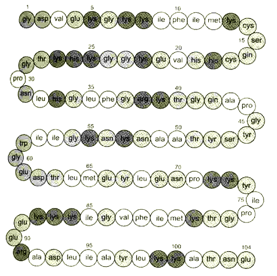 ¸ðµç »ý¸íü¸¦ ±¸¼ºÇÏ´Â ±âº» ±¸¼º ´ÜÀ§´Â ´Ü¹éÁúÀÌ´Ù. °¢°¢ÀÇ ´Ü¹éÁúÀº (20 °¡Áö »ö»óÁßÀÇ Çϳª·Î äÅÃµÈ È¤Àº 20 °¡Áö À¯ÇüÀÇ) ¾Æ¹Ì³ë»êÀ̶ó´Â ±¸½½, ¼ö ¹é ȤÀº ¼ö õ °³·Î ±¸¼ºµÈ ±¸½½ ¸ñ°ÉÀÌ·Î »ý°¢ÇÒ ¼ö ÀÖ´Ù. ÀÌ·¯ÇÑ ¾Æ¹Ì³ë»êµéÀº ¼¼Æ÷ ¼ÓÀÇ À¯Àü ¹°Áú Áï, DNA ¿¡ ÀúÀåµÇ¾îÀÖ´Â ¸í·É¿¡ µû¶ó ¼·Î °áÇÕÇÑ´Ù. ¾Æ¹Ì³ë»êµéÀÌ ¼·Î °áÇÕÇÑ °á°ú·Î ¸¸µé¾îÁø ´Ü¹éÁú »ç½½Àº ÀúÀý·Î Ưº°ÇÑ 3 Â÷¿ø Çü»óÀ¸·Î ÁÖ¸§Áø´Ù. ¾î¶² ´Ü¹éÁúÀÌ »ýü ³»¿¡¼ ¾î¶² ±â´ÉÀ» ¼öÇàÇϴ°¡´Â ´Ü¹éÁú »ç½½ÀÇ ÁÖ¸§ ¸ð¾ç¿¡ ÀÇÇÏ¿© °áÁ¤µÈ´Ù. ±×¸² 8 Àº ¼ÒÈ ±â°ü¿¡¼ ¹ß°ßµÇ´Â ½ÃÅäÅ©·Ò - c(cytochrome-c) ¶ó´Â ´Ü¹éÁúÀÇ ÀÏÂ÷¿ø ±¸Á¶ Áï, ÁÖ¸§À» Æí ¸ð¾çÀ» ³ªÅ¸³½´Ù. ÀÌ ´Ü¹éÁúÀº 104 °³ ¾Æ¹Ì³ë»êµéÀÇ »ç½½·Î ±¸¼ºµÇ¾î ÀÖÀ¸¸ç, °¢ ¾Æ¹Ì³ë»êÀÇ À̸§Àº Ãà¾àµÈ °ÍÀ¸·Î Ç¥±âÇÏ¿´´Ù. ±×¸² 9 ´Â ÀÌ ´Ü¹éÁúÀÌ »ýü ³»ºÎ¿¡ Á¸ÀçÇÒ ¶§ÀÇ ½ÇÁ¦ ¸ð½ÀÀ¸·Î¼ 3 Â÷¿ø Çü»óÀ¸·Î ÁÖ¸§Áø °ÍÀ» ³ªÅ¸³½´Ù.