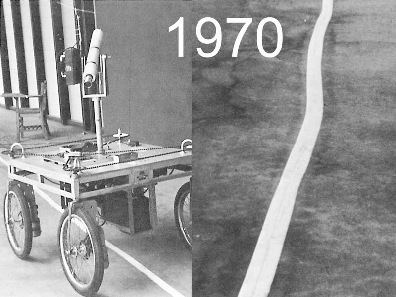 Stanford's Cart and SRI's Shakey : ¾Æ·¡ ±×¸²ÀÇ "Stanford Cart" ¿Í SRI ÀÇ "Shakey" ´Â ÄÄÇ»ÅÍ¿¡ ÀÇÇØ Á¦¾îµÇ´Â ÃÖÃÊÀÇ mobile robot ÀÌ´Ù (Å« mainframe ÀÌ ÃÊ´ç 25 ¸¸ÀÇ °è»êÀ» ¼öÇàÇϰí, radio ¿¡ ÀÇÇØ ·Îº¿¿¡ ¸µÅ©µÈ´Ù). µÑ´Ù TC camera °¡ ½Ã°¢ ¿ªÇÒÀ» ÇÑ´Ù. Cart ´Â Èò»ö ¶óÀÎÀ» µû¶ó¼ °ÅÀÇ È®½ÇÇÏ°Ô µû¶ó°£´Ù. Shakey ´Â È®½ÇÇÏÁö´Â ¾ÊÁö¸¸ Å©°í ´Ù¾çÇÑ (prismatic) ¹°Ã¼µéÀ» ãÀ» ¼ö ÀÖ´Ù. ±×°ÍµéÀÇ Á¦¾îÀÇ º¹ÀâÇÔÀº Elsie ¿¡¼³ª Beast ¿¡¼ º¸´Ùµµ ÈξÀ ´õ Å©´Ù (lines can be tracked using simple Elsie-like techniques with ground-mounted lights and photocells, but it takes complex adaptation and prediction to do it with ambient light from a high vantage point), ±×¸®°í ·Îº¿À» Á¦¾îÇϱâ À§ÇÑ ÄÄÇ»ÅÍÀÇ »ç¿ëÀº įºê¸®¾Æ±â (Cambrian explosion) ¿¡ ½Å°æ°è¸¦ °¡Áø ´Ù¼¼Æ÷ µ¿¹°ÀÇ ÃâÇö°ú ºñ±³µÉ ¼ö ÀÖ´Ù ; µÑ´Ù °¢ÀÚÀÇ ¿µ¿ª¿¡¼ ÇൿÀÌ º¹ÀâÇÑ °æ¿ì¿¡´Â ¾î¿ÁÙÀ» ¸ð¸¥´Ù (blew the lid).