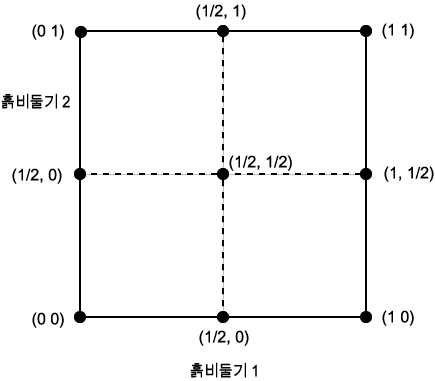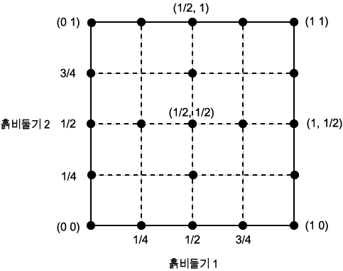 ÀÌÁ¦ ½ÉÆÇÀÌ µÎ °³ÀÇ »ç°ÝÀ» ¸íÁß (HIT), ½ÇÆÐ (MISS) ¹× ºÎºÐ (PARTIAL) À¸·Î ¦¬ 1, 0 ¹× 1/2 ·Î ¦¬ Á¡¼ö¸¦ ¸Å±ä´Ù°í »ý°¢ÇØ º¸ÀÚ. À̰ÍÀº 9(32) °¡ÁöÀÇ °¡´ÉÇÑ Á¡¼ö¸¦ ºÎ¿©ÇÑ´Ù. ¾ÆÈ© °¡ÁöÀÇ Á¡¼ö¿¿¡¼ ´Ù¼¸°¡Áö´Â ÇÇÆ® Á¡¼öÀ̰í Áß½ÉÁ¡ (1/2 1/2 1/2) Àº ±×°Íµé Áß ÇϳªÀÌ´Ù. Á¡¼ö °ÝÀÚ´Â »ç°¢ÇüÀ» Á¶±Ý ´õ ä¿ì°Ô µÈ´Ù (±×¸² 4).
