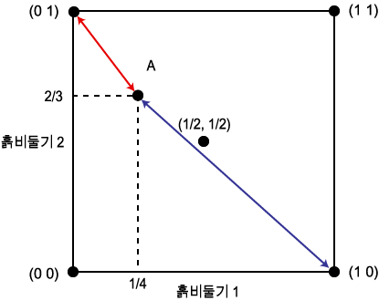 ¿©·¯ºÐÀº µÎ °³ÀÇ ¼±ÀÇ ±æÀÌ·Î ÆÛÁö ¿£Æ®·ÎÇǸ¦ ÃøÁ¤ÇÒ ¼ö ÀÖ´Ù. ÆÛÁö ÀÔ¹æÃ¼ ¾È¿¡¼ ÇϳªÀÇ Á¡À» °ñ¶ó ±×°ÍÀ» A ¶ó°í ºÎ¸£ÀÚ. »ç°Ý ¿¬½ÀÀåÀÇ °æ¿ì¿¡¼ ù° ¹ø ÈëºñµÑ±â¸¦ °ÅÀÇ °¡·ç·Î ¸¸µé¾úÁö¸¸ µÑ° ¹ø ÈëºñµÑ±â´Â ´ÜÁö ºÎºÐÀûÀ¸·Î Á¶°¢À» ¸¸µé¾úÀ» °æ¿ì¿¡ ÇØ´çÇÏ´Â Á¡¼ö (2/3 1/4) ¸¦ ¼±ÅÃÇÑ´Ù. ÀÌ Á¡¼ö ȤÀº ÆÛÁö ÁýÇÕ A ¸¦ ÀÔ¹æÃ¼¾ÈÀÇ ÇϳªÀÇ Á¡À¸·Î Ç¥½ÃÇÒ ¼ö ÀÖ´Ù (±×¸² 6).