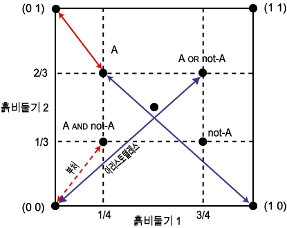 À̰ÍÀ» ÀÌ·¯ÇÑ ¹æ¹ýÀ¸·Î »ý°¢ÇØ º¸ÀÚ. ¸¸ÀÏ ¿©·¯ºÐÀÌ A ¸¦ °¡Áö°í ÀÖ´Ù¸é, not-A µµ °¡Áö°í ÀÖ´Ù. ±×·¡¼ ¿©·¯ºÐÀº ¶ÇÇÑ A AND not-A ¸¦ °¡Áö°í ÀÖ´Ù. ±×¸®°í ¶ÇÇÑ A OR not-A µµ °¡Áö°í ÀÖ´Ù. ÀÏ´Ü ¿©·¯ºÐÀÌ ÇϳªÀÇ ÁýÇÕ, Áï Á¡À» °¡Áö°í ÀÖÀ¸¸é ¸ðµç ³× °³ÀÇ ÁýÇÕµµ ¿ª½Ã °¡Áö°í ÀÖ°í, ¸ðµç ³× °³ÀÇ ÁýÇÕÀº ±×µé°ú °¡Àå °¡±î¿î ²ÀÁöÁ¡À¸·ÎºÎÅÍ °°Àº °Å¸®¿¡ À§Ä¡ÇØ ÀÖ´Ù. ÀÌ Á¤¸®´Â ÀÌ ÁýÇÕÀÇ ±æÀÌ, Áï ¼ÀÀ» »ç¿ëÇÑ´Ù. [¿©·¯ºÐÀº ÁýÇÕ (2/3 1/4) À» °¢ ÇÇÆ®µéÀ» ¸ðµÎ ´õÇÔÀ¸·Î½á ¼ÀÇÒ ¼ö ÀÖ´Ù. 1/3 + 1/4 = 11/12. ¿©·¯ºÐÀÌ »ç°Ý ¿¬½ÀÀå¿¡¼ ÀÚ½ÅÀÇ Á¡¼ö¸¦ ¾ò±â À§ÇÏ¿© ¸ðµç 1 °ú 0 À» ´õÇß´ø °Í°ú ¸¶Âù°¡Áö·Î ¸ðµç ÇÇÆ®¸¦ ´õÇÑ´Ù.] ºÓÀº ¼±ÀÇ ±æÀÌ´Â ºÎóÀÇ Ç×ÀÎ A AND not-A ÀÇ ¼À°ú °°´Ù. Ǫ¸¥ ¼±ÀÇ ±æÀÌ´Â ¾Æ¸®½ºÅäÅÚ·¹½ºÀÇ Ç×ÀÎ A OR not-A ÀÇ ¼À°ú °°´Ù. ¿©·¯ºÐÀº ÀÔ¹æÃ¼¿¡¼ ÀÌ·¯ÇÑ ±æÀ̵éÀÌ °°´Ù´Â °ÍÀ» ¾Ë ¼ö ÀÖÀ» °ÍÀÌ´Ù (±×¸² 8).