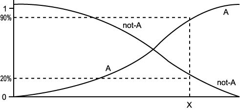 ÀÌ °æ»ç¼±ÀÌ °¡ÆÄ¸¦¼ö·Ï ±× ¿ë¾î´Â ´ú ÆÛÁöÇÏ´Ù. ¿©·¯ºÐÀº ¿Ã¹Ù¸¥ ¸ð¾çÀ» ¹ß°ßÇϱâ À§ÇØ ½ÉÁö¾î ½ÃÇè°ú ¼³¹®Áö¿Í ÀüÈ ¿©·Ð Á¶»ç¸¦ ÇÒ ¼öµµ ÀÖ´Ù. ÀÌ °æ»ç¼±Àº Äý°ú ¾Æ¸®½ºÅäÅÚ·¹½º°¡ ÀڽŵéÀÇ °æÁ÷µÈ ¼±À» °è¼Ó °¡Áú ¼ö ÀÖµµ·Ï ÇÑ´Ù. ÀÌ °æ»ç¼± ¾çÂÊ¿¡ È®°íÇÑ ºÎºÐÀÌ ÀÖ°í, ¾Æ¹«µµ °æÁ÷µÈ ¼±À» ±×¸®±â¸¦ ¿øÇÏÁö ¾Ê´Â °æ¿ì¿¡ ´ëÇØ °æ»ç¼±À» ±×¸± »ÓÀÌ´Ù. ¹°·Ð °æ»ç °î¼±Àº ¿©ÀüÈ÷ ÆÛÁö °î¼±ÀÌ´Ù. À̰ÍÀº °æ»ç ºÎºÐ¿¡¼´Â A AND not-A °¡ ¼º¸³Çϰí, ¾î¶² »ç¶÷ÀÌ Å°°¡ Å« µ¿½Ã¿¡ ۰¡ Å©Áö ¾Ê°í, ¾ð´öÀÌ »êÀÎ µ¿½Ã¿¡ »êÀÌ ¾Æ´Ï¸ç, ¾î¶² ºÐÀÚ°¡ Áö±¸ÀÇ ´ë±â¿¡ ¼ÓÇÏ¸é¼ ¶ÇÇÑ ¼ÓÇÏÁö ¾Ê´Â´Ù´Â °ÍÀ» ÀǹÌÇÑ´Ù. °æ»ç ºÎºÐÀÇ ¹Û¿¡¼´Â A OR not-A °¡ ¿©ÀüÈ÷ ¼º¸³ÇÑ´Ù.