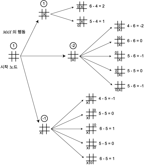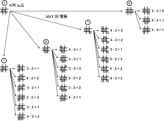 ü½º (chess) ³ª üĿ (checker), ¹ÙµÏ µî ÀϹÝÀûÀÎ °ÔÀÓµéÀÌ ÀÌ ¹üÁÖ¿¡ µé¾î°£´Ù´Â °ÍÀ» ¾Ë ¼ö ÀÖÀ» °ÍÀÌ´Ù. ½ÇÁ¦·Î ÀÌ·¯ÇÑ °ÔÀÓÀ» ÇÒ ¼ö ÀÖ´Â ÇÁ·Î±×·¥µéÀÌ ¸¸µé¾îÁ® ÀÖÀ¸¸ç, ¾î¶² °æ¿ì¿¡´Â èÇǾð ¼öÁØÀÇ ´É·ÂÀ» °¡Áø °Íµµ ÀÖ´Ù. Tic-Tac-Toe °ÔÀÓÀº Èï¹Ì ÀÖ´Â °è»ê ¹®Á¦´Â ¾Æ´ÏÁö¸¸, ´Ü¼øÇϱ⠶§¹®¿¡ Ž»ö ±â¹ýÀ» ¼³¸íÇÏ´Â µ¥ ¾ÆÁÖ À¯¿ëÇϹǷΠÀÌ °ÔÀÓÀ» »ç¿ëÇÒ °ÍÀÌ´Ù. ¾î¶² °ÔÀÓµéÀº (Backgammon °ú °°Àº) È®·üÀûÀÎ ¿ä¼Ò°¡ Æ÷ÇÔµÇ¾î ºÐ¼®ÇϱⰡ ´õ ¾î·Æ´Ù. ¸¹Àº °ÔÀÓµé, ƯÈ÷ ü½º¿Í °°ÀÌ ÆÇ À§¿¡¼ ÇÏ´Â °ÔÀÓµéÀÇ »óŰø°£À» ¼³Á¤ÇÏ´Â µ¥´Â ¾ÆÀÌÄÜ Ç¥ÇöÀÌ ÀÚ¿¬½º·´´Ù. 8 × 8 °ÝÀÚ °ø°£¿¡¼ Èæ°ú ¹é µÎ ·Îº¿ÀÇ ´Ù¾çÇÑ À§Ä¡¸¦ Ç¥ÇöÇϱâ À§ÇÏ¿© 8 × 8 ¹è¿À» »ç¿ëÇÑ ¹Ù ÀÖ´Ù. °ÔÀÓ¿¡¼ÀÇ ÇൿÀº ÇÑ »óÅ ǥÇöÀ» ´Ù¸¥ »óÅ ǥÇöÀ¸·Î ¹Ù²Ù´Â ¿¬»êÀÚ¿¡ ÀÇÇØ ³ªÅ¸³»¾îÁø´Ù. °ÔÀÓ ±×·¡ÇÁ´Â ½ÃÀÛ ³ëµå¿Í °¢ Ç÷¹À̾îÀÇ ¿¬»êÀÚ¿¡ ÀÇÇÏ¿© ¾Ï½ÃÀûÀ¸·Î Á¤ÀǵȴÙ. ù ¹øÂ° ÇൿÀ» ¼±ÅÃÇÏ´Â µ¥´Â ¿©·¯ °¡Áö ±â¹ýÀÌ »ç¿ëµÉ ¼ö ÀÖÁö¸¸, Ž»öÆ®¸®¸¦ ¸¸µå´Â °ÍÀº ÀÌÀü¿¡ Çß´ø °Í°ú °°Àº ¹æ¹ýÀ¸·Î ÇÒ ¼ö ÀÖ´Ù. ÀÌÁ¦ ÀÌ·¯ÇÑ ±â¹ýµéÀ» ¼³¸íÇϰڴÙ.