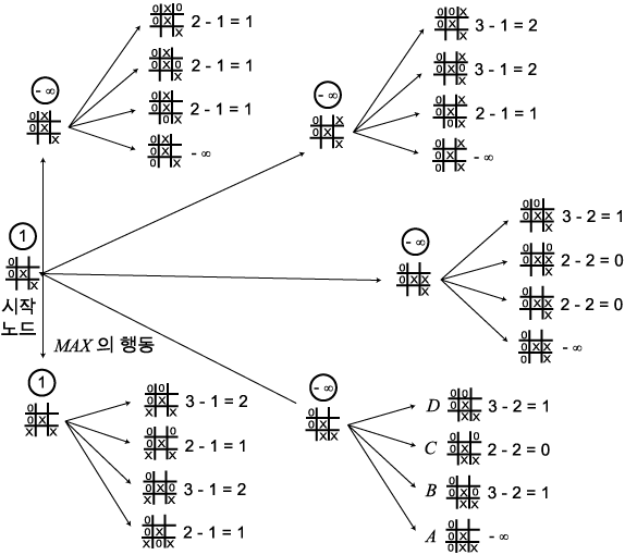 ÁÁÀº ù ¹øÂ° ÇൿÀº ÃÖ´ëÃÖ¼Ò ÀýÂ÷ (minimax procedure) ¶ó°í ÇÏ´Â ¹æ¹ý¿¡ ÀÇÇØ ¼±Á¤µÉ ¼ö ÀÖ´Ù (´Ü¼øÈÇϱâ À§Çؼ °ÔÀÓ ±×·¡ÇÁ°¡ Æ®¸®ÀÎ °ÍÀ¸·Î °¡Á¤ÇÏ°í °ü·ÃµÈ ÀýÂ÷µéÀ» ¼³¸íÇÑ´Ù). ¸¸ÀÏ MAX °¡ Ž»öÆ®¸®ÀÇ ´Ü¸» ³ëµå Áß¿¡¼ Çϳª¸¦ ¼±ÅÃÇÑ´Ù¸é Æò°¡ °ªÀÌ °¡Àå Å« °ÍÀ» ¼±È£ÇÑ´Ù°í °¡Á¤ÇÏÀÚ. MAX ´Â ÀÚ½ÅÀÇ Â÷·Ê°¡ µÇ¸é ½ÇÁ¦·Î ±× ³ëµå¸¦ ¼±ÅÃÇÒ °ÍÀ̱⠶§¹®¿¡ MIN ´Ü¸» ³ëµåÀÇ ºÎ¸ð ³ëµåÀÎ MAX ³ëµåÀÇ Àü´Þ°ª (backed-up value) Àº ´Ü¸» ³ëµåµé¿¡ ´ëÇÑ Æò°¡°ª Áß ÃÖ´ë°ªÀÌ µÈ´Ù. ¹Ý´ë·Î ¸¸ÀÏ MIN ÀÌ ´Ü¸» ³ëµå Áß¿¡¼ Çϳª¸¦ ¼±ÅÃÇÑ´Ù¸é °¡Àå ÀÛÀº °ª (À½¼ö·Î °¡Àå Å« °ª) À» °¡Áø ³ëµå¸¦ ¼±ÅÃÇÒ °ÍÀÌ´Ù. MIN Àº ÀÚ½ÅÀÇ Â÷·Ê°¡ µÇ¸é ½ÇÁ¦·Î ±× ³ëµå¸¦ ¼±ÅÃÇÒ °ÍÀ̱⠶§¹®¿¡ MAX ´Ü¸» ³ëµåÀÇ ºÎ¸ð ³ëµåÀÎ MIN ³ëµå´Â ´Ü¸» ³ëµåµé¿¡ ´ëÇÑ Æò°¡°ª Áß ÃÖ¼Ò°ªÀ» Àü´Þ°ªÀ¸·Î ¹Þ°Ô µÈ´Ù. ¸ðµç ´Ü¸» ³ëµåÀÇ ºÎ¸ð ³ëµåµé¿¡ Àü´Þ°ªÀÌ ÁöÁ¤µÈ ´ÙÀ½¿¡´Â, MAX ´Â ÀÚ½Ä MIN ³ëµåµé Áß¿¡¼ Àü´Þ°ªÀÌ ÃÖ´ëÀÎ ³ëµå¸¦ ¼±ÅÃÇϰí, MIN Àº ÀÚ½Ä MAX ³ëµåµé Áß¿¡¼ Àü´Þ°ªÀÌ ÃÖ¼ÒÀÎ ³ëµå¸¦ ¼±ÅÃÇÑ´Ù´Â °¡Á¤ÇÏ¿¡¼ ÀÌ °ªµéÀ» ÇÑ ´Ü°è À§·Î ´Ù½Ã Àü´ÞÇÑ´Ù.