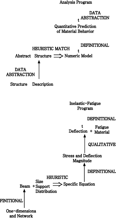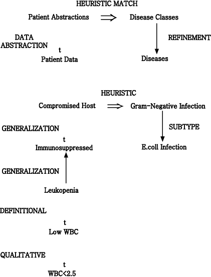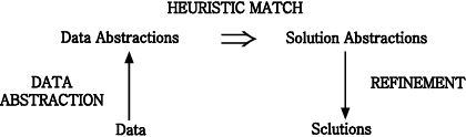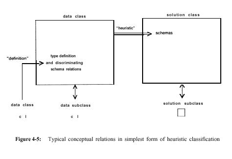 Kinds of inference in different stages of routine problem solving vary systematically, so data are often generalized or redefined, while solutions are more often matched schematically and refined. A domain-specific heuristic is a direct, non-hierarchical association between different classes. It is not a categorization of a ¡°stimulus¡± or ¡°cue¡± that directly matches a concept¡¯s definition. Rather, there may be a chain of abstraction inferences before reaching categories that usefully characterize problem features. This pattern is shown two ways in Figures 2-3 and 4-5. The inference structure of heuristic classification is common in expert systems, independent of the implementation representation in rules, frames, ordinary code, or some combination.