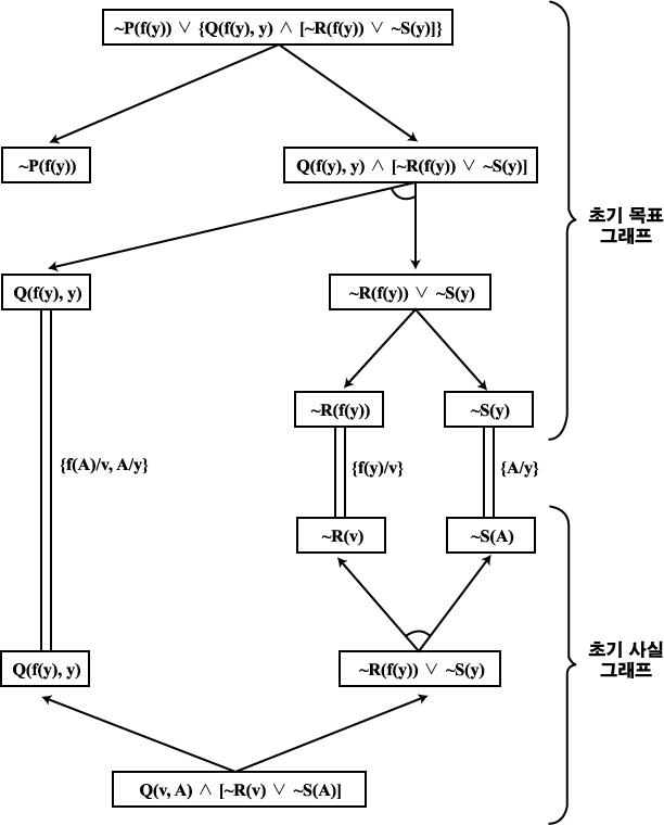 ÀÌ ±×·¡ÇÁÀÇ ÀÙ ³ëµåµéÀº ¸ñÇ¥ Ç¥ÇöÀÇ ¹®Àڵ鿡 ÀÇÇØ À̸§ÀÌ ºÙ¿©Á® ÀÖ´Ù. AND/OR ±×·¡ÇÁ¿¡¼, ·çÆ® (root) ³ëµåÀÇ ÀÚ¼ÕÀ» ºÎ¸ñÇ¥ (subgoal) ³ëµå¶ó°í ÇÑ´Ù. ÀÌ ¸ñÇ¥ wff ·ÎºÎÅÍ »ý¼ºµÇ´Â ÀýµéÀº ÀÙ ³ëµå¿¡ Á¾°áµÇ´Â ÇØ°á ±×·¡ÇÁ¸¦ µû¶ó°¡¸é¼ À¯µµÇÒ ¼ö ÀÖ´Ù. Áï,