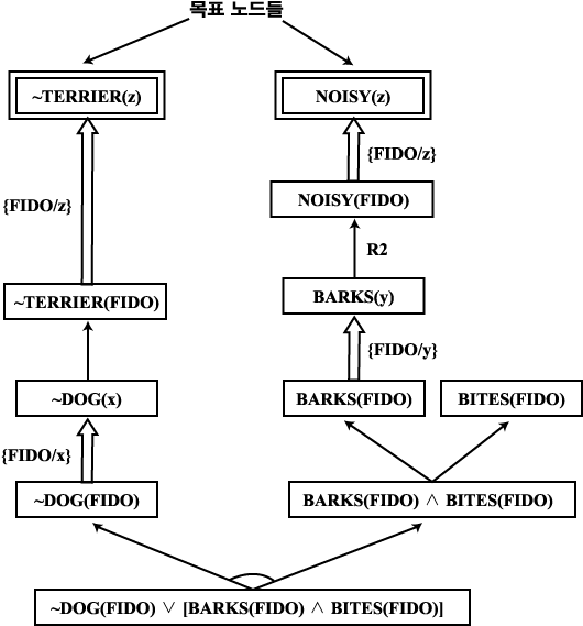 À̷κÎÅÍ ~TERRIER(z) ¡ý NOISY(z) ·Î ÁÖ¾îÁö´Â ¸ñÇ¥ wff ¸¦ Áõ¸íÇϰíÀÚ ÇÑ´Ù. ¿©±â¼ z ´Â Á¸ÀçÇÑÁ¤º¯¼öÀÌ´Ù. ÀÌ ¹®Á¦ÀÇ AND/OR ±×·¡ÇÁ´Â ¾ÕÀÇ ±×¸² 17 °ú °°´Ù. ÀÌ AND/OR ±×·¡ÇÁ ¾È¿¡¼ ÀÏÄ¡µÇ´Â ÇØ°á ±×·¡ÇÁ´Â {FIDO/x}, {FIDO/y}, {FIDO/z} ÀÇ Ä¡È¯À» °¡Áø´Ù. ÀÌ Ä¡È¯µéÀÇ ´ÜÀÏÈ °áÇÕÀº {FIDO/x, FIDO/y, FIDO/z} ÀÌ µÇ¸ç, À̰ÍÀ» ¸ñÇ¥ ¹®Àڵ鿡 Àû¿ëÇÏ¸é ´ÙÀ½°ú °°Àº °á°ú¸¦ ¾ò´Â´Ù.
