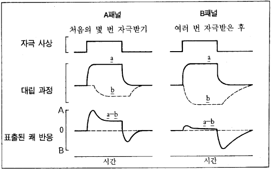 °á±¹ ¼Ö·Î¸ó°ú ÄÚºñÆ® (J. D. Corbit) ´Â ÀÌ·¯ÇÑ ¸î¸î ¿¹µéÀ» ¼öÁýÇϰí À̵éÀ» ¼³¸íÇϱâ À§ÇÏ¿© ´ë¸³ °úÁ¤·Ð (opponent - process theory) À̶ó°í ¾Ë·ÁÁø ÀÌ·ÐÀ» Á¦¾ÈÇÏ¿´´Ù. ù°, ÀÌ ÀÌ·ÐÀº Äè¶ô (hedonic) ÀÌ·ÐÀÌ´Ù. Áï Äè°¨°ú ºÒÄè°¨À» ´Ù·é´Ù. µÑ°, ¸ðµç ´À³¦¿¡´Â ±× ´ë¸³ ¹ÝÀÀ (¹Ýµå½Ã µî½Ä °ü°è´Â ¾Æ´ÏÁö¸¸) ÀÌ ÀÖ´Ù°í ÀÌ ÀÌ·ÐÀ» ¿ä¾àÇÒ ¼ö ÀÖ´Ù. ¿ø·¡ ´À³¦°ú ±× ¹Ý´ëµÇ´Â ¹ÝÀÀÀÌ ´ë¸³ °úÁ¤À̹ǷΠ±× À̷п¡ ÀÌ·¯ÇÑ ¸íĪÀÌ ÁÖ¾îÁö°Ô µÇ¾ú´Ù. ¼Â°, ¹Ý´ë ¹ÝÀÀÀº ¹Ýº¹µÈ °æÇè°ú ÇÔ²² À§ÀÇ ¿¹¿¡¼ ÁÖ¸ñÇÏ¿´´ø º¯È¸¦ ³»¸é¼ Á¡Â÷ Áõ°¡ÇÑ´Ù. Äè°¨°ú ºÒÄè°¨ ¸ðµÎ¿¡ ÀÌ·¯ÇÑ ´ë¸³ °úÁ¤ÀÌ ÀÛ¿ëÇϴµ¥ óÀ½¿¡´Â ¾àÇÏÁö¸¸ À¯ÄèÇÑ ¶Ç´Â ºÒÄèÇÑ °æÇèÀÌ ¹Ýº¹µÇ¸é¼ ´õ¿í´õ °ÇØÁø´Ù.