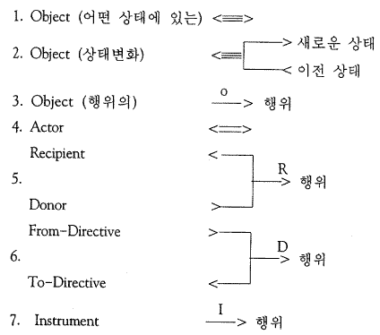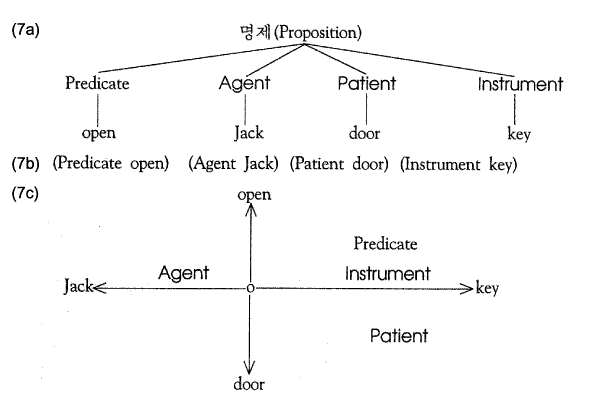 À§¿¡¼Ã³·³ ¼ø¼öÇÏ°Ô Åë»çÀûÀÎ ºÐÇØ ´Ü°è°¡ °¡Á¤µÈ´Ù. ±×°ÍÀº '¡¦ ´Ü¾îÀÇ Ç¥¸é ¿¬¼â¿¡¼ ¸í»ç±¸, ÀüÄ¡»ç±¸, ½ÃÁ¦ µ¿»ç³ª µ¿»ç±¸, ±×¸®°í ºÎ»ç³ª ºÎ»ç±¸¿Í °°Àº ¿ä¼ÒµéÀ» ÀνÄÇÒ ¼ö ÀÖ´Ù' (Celce-Murcia, 1975;104f). »ç¿ëµÈ °Ýµé ('±â´ÉÀû °ü°èµé') Àº Theme (=Patient), Causal Actant (CA), Locus, Source ¿Í Goal ÀÌ´Ù. 1Àý 1 °Ý (one-case-per-clause) ÀÇ ¿ø¸®´Â À¯ÁöµÇÁö¸¸ CA ´Â Á÷Á¢ (direct) °ú °£Á¢ (indirect) À¸·Î ÇÏÀ§ ±¸ºÐµÈ´Ù. °¢°¢ Agent ¿Í Instrument ¿¡ ´ëÀÀÇÏ¸ç ±× Â÷ÀÌ´Â ±×°ÍµéÀÌ °ø±âÇÒ ¶§¿¡ È®À뵃 »ÓÀÌ´Ù (p.16). Goal (±×¸®°í ´Ù¸¥ ¿ªÇÒµé ) Àº '°¡±î¿î (immediate)' °ú '¸Õ (remote)' »çÀÌ¿¡¼ ±¸ºÐµÈ´Ù -´ë·« 9 Àå¿¡¼ º¸¾Ò´ø ³»Àû (inner) ´ë ¿ÜÀû (outer) ÀÇ ±¸ºÐ.