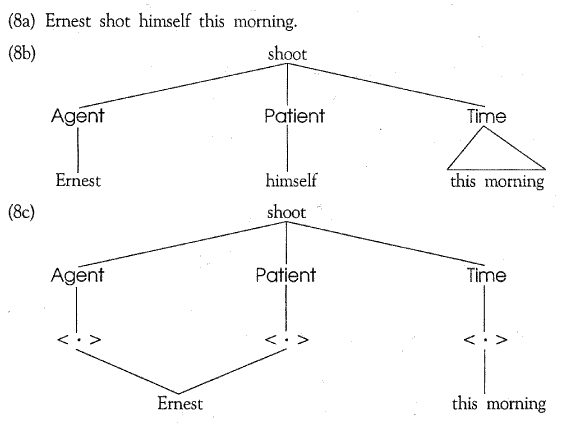 ´õ Áß¿äÇÑ °ÍÀº ½½·ÔÀ» ä¿ì´Â ´ë»óÀÇ ÁöÀ§ÀÌ´Ù. CF1s ¿¡¼ ±×°ÍÀº ÀϹÝÀûÀ¸·Î ´Ü¾îÀ̰ųª Àû¾îµµ ¸í»ç±¸¿Í °°Àº Åë»çÀû ±¸¼º¹°ÀÌ´Ù. ±×·¯³ª CF3s ¿¡¼ ±×°ÍÀº ÀϹÝÀûÀ¸·Î °³³ä (Simmons ¿¡¼Ã³·³ ) ¿¡ ´ëÇÑ È¤Àº ½ÇÁ¦ ½Çü¿¡ ´ëÇÑ Æ÷ÀÎÅÍÀÌ´Ù. À̰ÍÀº ¹®Àå (8a) À» À§ÇÑ CF1 (8b) ¿¡¼ Patient ±³Á¡Àº ¾ð¾îÀû ¿ä¼Ò himself ¿¡ ÀÇÇØ ä¿öÁø´Ù. ÀÌ ±³Á¡ÀÌ Agent ½½·ÔÀÇ ÇÊ·¯ [ Æ÷ÀÎÅ͸¦ °®´Â °ÍÀ̶ó¸é ¾î´À Ç¥»óÀ̵çÁö ´õ ÀÎÁöÀûÀΠǥ»ó (8c) ÀÌ´Ù.