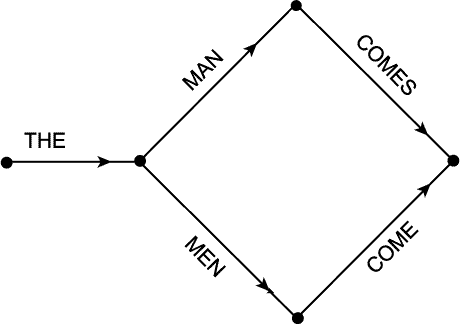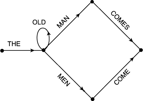 ¹®¹ýÀº È®½ÇÈ÷ À¯ÇÑÀ̾î¾ß ÇÑ´Ù´Â °ÍÀÌ ÇϳªÀÇ ÇÊ¿äÁ¶°ÇÀÌ´Ù.¨Î µû¶ó¼ ¹®¹ýÀº ´Ü¼øÈ÷ ¸ðµç ÇüÅÂ¼Ò (¶Ç´Â ´Ü¾î) ¿¬°áüÀÇ ¸ñ·Ï(lest)ÀÌ µÇ¾î¼´Â ¾ÈµÈ´Ù. ÀÌ·¯ÇÑ ¿¬°áüÀÇ ¼ö´Â ¹«ÇÑÀ̱⠶§¹®ÀÌ´Ù. ¿ì¸®°¡ Àß ¾Æ´Â ¾ð¾î¿¡ ´ëÇÑ ÇÑ Åë½ÅÀÌ·ÐÀÇ ¸ðÇü(communication theoretic model) ÀÌ À§ÀÇ ¹®Á¦¸¦ ÇØ°áÇÏ¿© ÁØ´Ù. ¿ì¸®¿¡°Ô ÇϳªÀÇ ±â°è°¡ ÀÖ´Ù°í ÇÏÀÚ. ±× ±â°è´Â À¯ÇѼöÀÇ ³»Àû»óÅ (internal state) ¸¦ Áö´Ï°í ÀÖÀ¸¸ç, ÀÌ ±â°è°¡ ÇϳªÀÇ »óÅ¿¡¼ ´Ù¸¥ »óÅ·ΠÀüȯÇÒ ¶§¸¶´Ù ÇϳªÀÇ ¾î¶² ±âÈ£(symbol) (¿µ¾îÀÇ ´Ü¾î¶ó°í ÇÏÀÚ) ¸¦ ¸¸µç´Ù°í ÇÏÀÚ. ÀÌ »óÅ °¡¿îµ¥ÀÇ Çϳª°¡ "ÃÖÃÊ»óÅ (initial state)" À̰í, ´Ù¸¥ ¶Ç Çϳª´Â "ÃÖÁ¾»óÅÂ(final state)"ÀÌ´Ù. ±× ±â°è°¡ ÃÖÃÊ»óÅ¿¡¼ Ãâ¹ßÇÏ¿© ¸î ´Ü°èÀÇ »óŸ¦ Áö³ª(¸Å »óŸ¶´Ù ÇϳªÀÇ ´Ü¾î¸¦ ¸¸µé¸é¼) ÃÖÁ¾»óÅ¿¡ À̸¥´Ù°í ÇÏÀÚ. ÀÌ·¸°Ô ÇØ¼ ÀÌ·ç¾îÁø ´Ü¾îÀÇ ¿¬°áü¸¦ "¹®Àå( sentence)" À̶ó°í ºÎ¸¥´Ù. °á°úÀûÀ¸·Î ÀÌ·¯ÇÑ ±â°è´Â À§¿¡ ¼³¸íÇÑ ¾ç½ÄÀ¸·Î ¾î???¾î¸¦ ±ÔÁ¤ÇÏ°Ô µÈ´Ù. Áï À§¿¡ ¸»ÇÑ ¾ç½ÄÀ¸·Î ÀÌ·ç¾îÁú ¼ö ÀÖ´Â ¹®ÀåÀÇ ÁýÇÕÀ» ±ÔÁ¤ÇÑ´Ù´Â °ÍÀÌ´Ù. ±×¸®°í ÀÌ·¯ÇÑ Á¾·ùÀÇ ±â°è°¡ ¸¸µé¾î³»´Â ¾ð¾î¸¦ "À¯ÇÑ»óžð¾î (finite state language )" ¶ó°í ºÎ¸£¸ç, ±× ±â°è ÀÚü´Â "À¯ÇÑ»óŹ®¹ý(finite state grammar )"À̶ó°í ÇÑ´Ù. À¯ÇÑ»óÅ ¹®¹ýÀ» "»óŵµÇ¥(state diagram)" ¶ó´Â(ÁÖ¼® : C. E. Shannon and W. Weaver , The mathematical theory of Communication (Urbana, 1949), pp.15f.) Çü½ÄÀ¸·Î µµÇ¥ÈÇÒ ¼ö ÀÖ´Ù. ¿¹¸¦ µé¸é, "the man comes"¿Í "the men come"À̶ó´Â µÎ ¹®À常À» ¸¸µå´Â ¹®¹ýÀº ´ÙÀ½°ú °°Àº »óŵµÇ¥·Î Ç¥½ÃÇÒ ¼ö ÀÖ´Ù.: