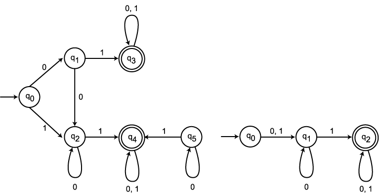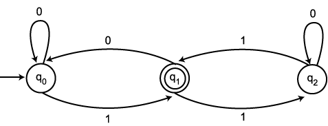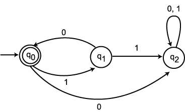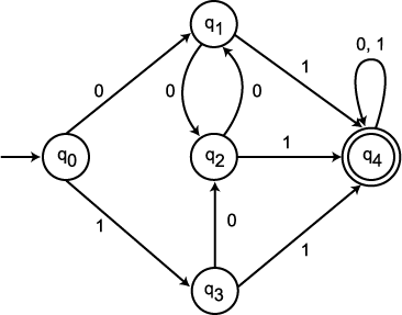 ÀÌ dfa ´Â ¹®ÀÚ¿ 01 À» ½ÂÀÎÇÑ´Ù. »óÅ q0¿¡¼ ½ÃÀÛÇÏ¿©, ¸ÕÀú ½Éº¼ 0ÀÌ ÀÐÇôÁø´Ù. À̶§ ±×·¡ÇÁÀÇ °£¼±µéÀ» »ìÆìº¸¸é, ¿ÀÅ丶Ÿ´Â »óÅ q0 ¿¡ ³²°Ô µÊÀ» ¾Ë ¼ö ÀÖ´Ù. ´ÙÀ½À¸·Î 1 ÀÌ ÀÐÇôÁö°í ¿ÀÅ丶ŸÀÇ »óÅ´ q1 À¸·Î ÀüÀ̵ȴÙ. ÀÌÁ¦ ¿ÀÅ丶Ÿ´Â ¹®ÀÚ¿ÀÇ ³¡¿¡ ³õÀ̰í, µ¿½Ã¿¡ Á¾·á »óÅ¿¡ ÀÖ°Ô µÇ¹Ç·Î ¹®ÀÚ¿ 01ÀÌ ½ÂÀεȴÙ. ÀÌ dfa °¡ ¹®ÀÚ¿ 00 Àº ÀνÄÇÏÁö ¸øÇÑ´Ù. ±× ÀÌÀ¯´Â µÎ °³ÀÇ 0 À» ÀÐÀº ÈÄ¿¡ ¿ÀÅ丶Ÿ´Â »óÅ q0 ¿¡ ÀÖ°Ô µÇ¸ç ÀÌ´Â Á¾·á »óŰ¡ ¾Æ´Ï±â ¶§¹®ÀÌ´Ù. ºñ½ÁÇÑ ÀÌÀ¯·Î, ÀÌ ¿ÀÅ丶Ÿ°¡ ¹®ÀÚ¿ 101, 0111, 11001 µîÀ» ½ÂÀÎÇÏÁö¸¸, 100, 1100 µîÀº ½ÂÀÎÇÏÁö ¸øÇÔÀ» ¾Ë ¼ö ÀÖ´Ù.
