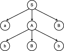 À¯µµ °úÁ¤À» º¸ÀÌ´Â ¶Ç ´Ù¸¥ ¹æ¹ýÀ¸·Î À¯µµ Æ®¸® (derivation tree) °¡ ÀÖ´Ù. ÀÌ Ç¥Çö ¹æ¹ýÀº »ç¿ëµÈ »ý¼º±ÔÄ¢µéÀÇ ¼ø¼¿Í´Â ¹«°üÇÏ´Ù. À¯µµ Æ®¸®´Â ¼ø¼ Æ®¸® (ordered tree) ·Î¼ ºÎ¸ð ³ëµå´Â »ý¼º±ÔÄ¢ÀÇ Áº¯¿¡ ÀÖ´Â º¯¼ö (ȤÀº ºñ´Ü¸») ·Î ¶óº§ÀÌ ÁÖ¾îÁö°í, ÀÌ ³ëµåÀÇ ÀÚ½Ä ³ëµåµéÀº ´ëÀÀµÇ´Â ¿ìº¯¿¡ ÀÖ´Â ½Éº¼µéÀ» Ç¥ÇöÇÑ´Ù. ¿¹¸¦ µé¸é, ±×¸² 1 Àº ´ÙÀ½ÀÇ »ý¼º±ÔÄ¢¿¡ ´ëÇÑ À¯µµ Æ®¸®ÀÇ ÇÑ ºÎºÐÀ» º¸¿©ÁÖ°í ÀÖ´Ù.