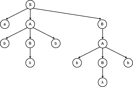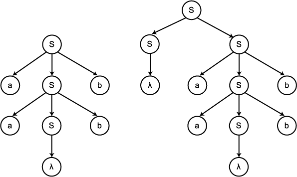 »ý¼º±ÔÄ¢ S ¡æ aSb | SS | ¥ë ¸¦ °®´Â ¹®¹ý G ´Â ¸ðÈ£ÇÏ´Ù. ÀÌ´Â ±×¸² 4 ¿¡¼¿Í °°ÀÌ µÎ °³ÀÇ À¯µµ Æ®¸®µéÀ» °®´Â ¹®ÀÚ¿ aabb °¡ Á¸ÀçÇϱ⠶§¹®ÀÌ´Ù. ¿©±â¼ µÎ °³ÀÇ À¯µµ Æ®¸®´Â ¼·Î ±¸Á¶°¡ »óÀÌÇÏ´Ù´Â °ÍÀ» ¾Ë ¼ö ÀÖ´Ù. µû¶ó¼ ÀÌ´Â aabb ¿¡ ´ëÇÑ ÁÂÃø¿ì¼± À¯µµ (ȤÀº ¿ìÃø¿ì¼± À¯µµ) µéÀÌ ¿ª½Ã µÎ °³ Á¸ÀçÇÑ´Ù´Â °ÍÀ» ÀǹÌÇÑ´Ù.