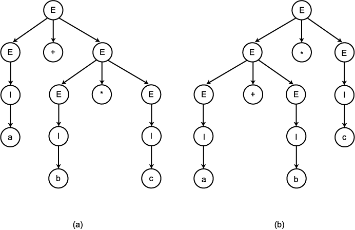 (a + b) * c ¿Í a * b + c ¿Í °°Àº ¹®ÀÚ¿µéÀÌ L(G) ¿¡ ¼ÓÇÑ´Ù. ¹®¹ý G °¡ C ³ª Pascal °ú °°Àº ÇÁ·Î±×·¡¹Ö ¾ð¾î¿¡ ´ëÇÑ »ê¼ú½ÄµéÀÇ Á¦ÇÑµÈ ºÎºÐÁýÇÕÀ» »ý¼ºÇÏ´Â °ÍÀ» ½±°Ô ¾Ë ¼ö ÀÖ´Ù. ¹®¹ý G ´Â ¸ðÈ£ÇÏ´Ù. ÀÌ´Â ¹®ÀÚ¿ a + b * c °¡ ±×¸² 5 ¿¡¼¿Í °°ÀÌ »óÀÌÇÑ À¯µµ Æ®¸®µéÀ» °®°í Àֱ⠶§¹®ÀÌ´Ù.