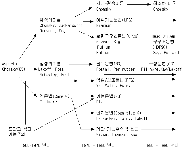 Noam chomsky ´Â ¾ð¾îÇÐÀ» ÀÎÁö ½É¸®ÇÐÀ¸·Î ȯ¿øÇß´Ù. Áï Àΰ£Àº ¼±ÃµÀûÀ¸·Î ¾ð¾î ´É·Â(competence)À» Ÿ°í ³µÀ¸¸ç, ÈÄõÀû ÇнÀ¿¡ ÀÇÇØ ¾ð¾î ¼öÇà(performance)ÀÌ °¡´ÉÇÏ´Ù°í º¸¾Ò´Ù.À̶§ ¹®¹ýÀº Àΰ£ÀÇ ¾ð¾î ´É·Â¿¡ ÀÇÇØ ÇØ¼®µÇ¾î ¹«ÇÑÇÑ ÀÚ¿¬¾î¸¦ »ý¼ºÇÒ ¼ö ÀÖ´Â À¯ÇÑÇÑ ±ÔÄ¢À¸·Î Á¤ÀÇ µÉ ¼ö ÀÖ´Ù.ÀÌ ¹®¹ý¿¡ ´ëÇÑ ¼öÇÐÀû ¸ðÇüÀÌ Çü½Ä ¹®¹ý (formal grammar) À¸·Î¼ Àç±ÍÀû(recursive) ¹æ¹ý¿¡ ÀÇÇØ À¯ÇÑÇÑ ±ÔÄ¢À¸·Î ¹«ÇÑÇÑ ¹®ÀåÀÇ »ý¼ºÀÌ °¡´ÉÇÏ°Ô ÇÑ´Ù.±×ÀÇ º¯Çü-»ý¼º¹®¹ýÀº ±×°ÍÀÇ ¸ñÇ¥°¡ ±¸Á¶-±â´ÉÁÖÀÇ ¾ð¾îÇÐÀ̳ª ÇൿÁÖÀÇ ½É¸®ÇÐÀÇ ±Øº¹À̾ú°í ¶Ç ½ÇÁ¦·Î ±×°ÍµéÀ» ±Øº¹Çϱ⵵ ÇßÁö¸¸, ¸¶¸£Å©½Ã½ºÆ® ¾ð¾îÇÐÀÚµéÀÌ º¸±â¿¡ ±×°ÍÀº ¿©ÀüÈ÷ ±¸Á¶ÁÖÀÇÀÇ »ö´Ù¸¥ º¯Á¾ÀÏ »ÓÀ̾ú´Ù. ÃνºÅ°ÀÇ ¾ð¾îÇÐ, Áï ÀÎÁö½É¸®ÇÐÀº ¼ö¼¼±â µ¿¾È ÀáÀÚ°í ÀÖ´ø µ¥Ä«¸£Æ®¸¦ ±ú¿ö³»°í ÀØÇôÁ® ÀÖ´ø Æ÷¸£ ·ç¾Æ¾âÀ» º¹±Ç½Ã۸ç À̼ºÁÖÀÇÀÇ ¸£³×»ó½º¸¦ ¼±¾ðÇß´Ù.
