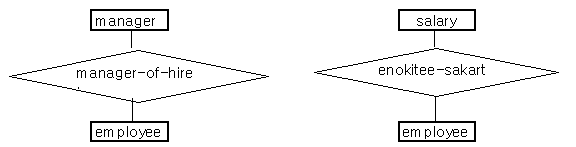 ±×¸² 8 ¿¡¼ manager_of_hire ´Â µÎ °³ÀÇ ¼Ó¼ºÀÎ employee ¹× manager ¸¦ °¡Áö°í ÀÖ´Ù. À̶§ÀÇ °ü°è°ªÀº emjployee ¹× manager ÀÇ ½Ö (pair) À¸·Î ÀÌ·ç¾îÁ® ÀÖ´Ù. ¸¸¾à¿¡ employee °¡ ¿ÀÁ÷ ÇϳªÀÇ À̸§¸¸ °¡Áö°í ÀÖ´Ù°í ÇÑ´Ù¸é, employee À̸§Àº salary ¹× manager ¸ðµÎ¿¡ ´ëÇÑ Å° (key) °¡ µÈ´Ù.