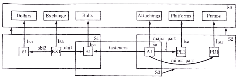 (1) ÀÇ °æ¿ì´Â ÇϳªÀÇ µ¥ÀÌÅͺ£À̽º·Î½á ¸ðµç Âü¿©ÀÚÀÇ »ý°¢À» ³ªÅ¸³»°Ô µÇÁö¸¸, (2) ÀÇ °æ¿ì´Â, ÇÑ »ç¶÷ÀÌ »ý°¢ÇÏ´Â °ÍÀ» ´Ù¸¥ »ç¶÷ÀÌ °Íµé°ú ±¸ºÐÇÏ¿©¾ß ÇÑ´Ù. À̸¦ À§ÇÑ ¹æ¹ýÁßÀÇ Çϳª´Â ºÐÇÒµÈ ÀǹÌȸ·Î (semantic nets) ¸¦ »ç¿ëÇÏ´Â °ÍÀε¥, ÀÌ´Â ÀÌ¹Ì 6 Àå¿¡¼ ´Ù·é¹Ù ÀÖ´Ù. ±×¸² 23 Àº ºÐÇÒµÈ °ø°£ (space) À» ÀÌ¿ëÇÑ °ÍÀÌ´Ù. ¿©±â¼´Â ¼¼ °¡Áö ´Ù¸¥ °ø°£ÀÌ Á¸ÀçÇÑ´Ù.