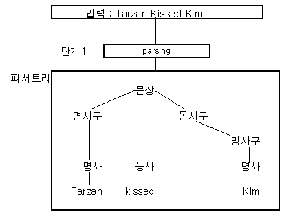 ´ÙÀ½ ±×¸²°ú °°ÀÌ parsing ¿¡¼´Â ÁÖ¾î-µ¿»ç, µ¿»ç-¸ñÀû¾î µî°ú °°Àº Áß¿äÇÑ ¾ð¾îÇÐÀûÀÎ °ü°è¸¦ Çü¼ºÇÔ¿¡ ÀÇÇÏ¿© parser tree ·Î Ç¥ÇöµÈ´Ù, ´Ü¾î ºÐ¼®±â(parser)¿¡¼´Â Semantic analysis ¿¡ ´ëÇÑ ±â¹ÝÀ» Á¦°øÇÑ´Ù.