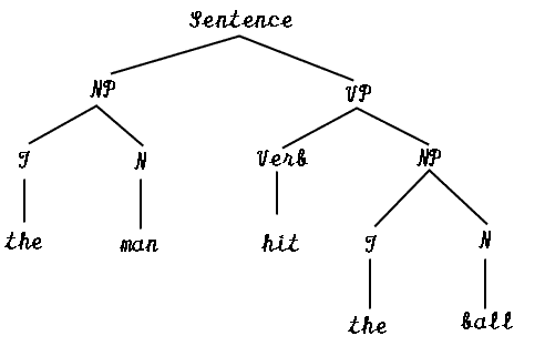 ´Ù½Ã ¸»Çϸé, ©ôÀÇ µÑ° ÁÙÀº ©óÀÇ ±ÔÄ¢(rule) (¥¡)¿¡ µû¶ó¼ Sentence ¸¦ NP + VP ·Î °íÃÄ ¾´ °ÍÀ̰í, ¼Â°ÁÙÀº ©óÀÇ ±ÔÄ¢ (¥¢)¿¡ µû¶ó¼ NP ¸¦ T + N ·Î °íÃÄ ¾¸À¸·Î½á ¼º¸³µÈ °ÍÀÌ´Ù. ©õ¿Í °°Àº µµÇ¥´Â ©ôÀÇ À¯µµ°úÁ¤À» ¸íÈ®È÷ ³ªÅ¸³½´Ù. ±×·¯³ª ©ô¿¡ ³ªÅ¸³ ±ÔÄ¢¿¡ Àû¿ëµÈ ¼ø¼°¡ ©õ¿¡´Â ³ªÅ¸³ª ÀÖÁö ¾Ê±â ¶§¹®¿¡ µµÇ¥ ©õ´Â ©ô¶ó´Â À¯µµ°úÁ¤º¸´Ù Á¤º¸ÇÔÀ¯·®(information)ÀÌ Àû´Ù. ©ô°¡ ÁÖ¾îÁö¸é ©õ¸¸À» À¯ÀÏÇϰÔ(uniquely) ±¸¼ºÇÒ ¼ö ÀÖ´Ù. ±×·¯³ª À̰ÍÀÇ ¿ªÀº ¼º¸³µÇÁö ¾Ê´Â´Ù. ±× ÀÌÀ¯´Â ±ÔÄ¢Àû¿ëÀÇ ¼ø¼¸¦ ´Þ¸®ÇÏ´Â À¯µµ°úÁ¤À¸·Î¼µµ °°Àº ©õ¸¦ ¸¸µé ¼ö Àֱ⠶§¹®ÀÌ´Ù.¨Î µµÇ¥ ©õ´Â ©ô¿¡ ³ªÅ¸³ Á¤º¸ °¡¿îµ¥¼ À¯µµµÈ ¹®Àå(derived sentence) "the man hit the ball"ÀÇ ±¸Àý±¸¼º(±¸¼º¼ººÐÀÇ ºÐ¼®)À» °áÁ¤Çϴµ¥ ºÒ°¡°áÇÑ Á¤º¸¸¸À» º¸À¯Çϰí ÀÖ´Ù. ÀÌ ¹®Àå¿¡¼ ¾î¶°ÇÑ ´Ü¾î¿¬°áüÀ̰ǰ£¿¡ ÇϳªÀÇ ¿øÁ¡(point of origin)À¸·Î µÚ¹â¾Æ ¿Ã¶ó°¥[ÃßÀû] ¼ö ÀÖ°í, ÀÌ ¿øÁ¡ÀÌ Z ¶ó°í Ç¥½Ã µÇ¾î ÀÖÀ¸¸é, ±× ¿¬°áü¸¦ Z ÇüÀÇ ±¸¼º¼ººÐ(constituent)À̶ó°í ÇÑ´Ù. µû¶ó¼ "hit the ball"À» ©õ¿¡¼ VP ·Î ÃßÀûÇÒ ¼ö Àֱ⠶§¹®¿¡, À¯µµµÈ ¹®Àå¿¡¼ "hit the ball"À» VP ¶ó°í ÇÑ´Ù. ¹Ý¸é, "man hit"À̶ó´Â ¿¬°áü´Â ©õ¿¡¼ ÃßÀûµÇ¾î ¿Ã¶ó°¥ ¼ö ÀÖ´Â ¿øÁ¡ÀÌ ¾ø±â ¶§¹®¿¡, "man hit"´Â Àü¿¬ ±¸¼º¼ººÐÀÌ µÉ ¼ö ¾ø´Ù.