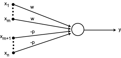 McCulloch-Pitts ¸ðµ¨ÀÇ ±¸Á¶¸¦ ¾Æ·¡¿¡ µµ½ÃÇÏ¿´´Ù. ´º·±Àº ÀÎÁ¢ÇÑ ¿©·¯ ´º·±µé·ÎºÎÅÍ ½ÅÈ£¸¦ ¼ö½ÅÇϸç, ´º·±°£ÀÇ ½Ã³À½º ¿¬°á°µµ¿¡´Â ÈïºÐ¼º°ú ¾ïÁ¦¼ºÀÇ 2 °¡Áö À¯ÇüÀÌ ÀÖ´Ù.