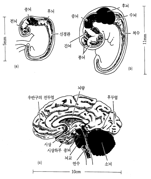(a) ÀӽЏî ÁÖÈÄ ½Å°æ°üÀÇ ¸Ó¸® ³¡ºÎºÐÀº 3 °³ÀÇ ÁÖ¿ä ºÎºÐÀ» ³ªÅ¸³½´Ù. (b) ÀӽŠ6 ÁÖÈÄ ³úÀÇ ÁÖ¿ä ºÎºÐÀÌ º¸ÀδÙ. (c) ÀÌ ºÎºÐµéÀÇ À§Ä¡°¡ ¼ºÀγú¿¡ Á¦½ÃµÇ¾î ÀÖ´Ù. |