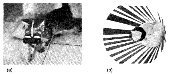 (a) ¼±ÅÃÀûÀ¸·Î ½ÃÀÚ±ØÀ» Á¦°øÇϱâ À§ÇØ ¸¶½ºÅ©¸¦ ¾º¿î °í¾çÀÌ »õ³¢. ÀÚ±Ø ÇüÅ´ µÎ °³ÀÇ Èò ¿øÅëÀÇ ³¡¿¡ ÀÖ´Â °ËÀº ÇÃ¶ó½ºÆ½ Á÷°¢ÆÇ Ç¥¸é³»¿¡ ¼³Ä¡µÇ¾î ÀÖ´Ù. (b) Å« ¿øÅë³»ÀÇ ¼öÁ÷¹«´Ì¿¡ ³ëÃâ½ÃŲ °í¾çÀÌ »õ³¢. [(a); Hirsch¿Í Spinelli, 1971. (b) Blakemore, 1974.] |