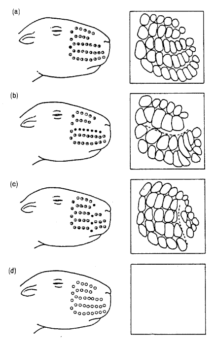 ü¼º°¨°¢ ÇÇÁú¿¡ ÀÖ´Â ÇÇÁúÅëÀÇ ¹è¿ÀÌ ¿À¸¥ÂÊ¿¡ º¸¿©Áø´Ù. (a) °¢°¢ÀÇ ÇÇÁúÅëÀº ¹Ý´ë À§Ä¡¿¡ ÀÖ´Â »ýÁãÄÚÀÇ ÇÑ ¼ö¿°À¸·ÎºÎÅÍ Á¤º¸¸¦ ¹Þ´Â´Ù. (b), (c) ¸¸¾à¿¡ ¼ö¿°ÀÇ ÇÑ ÁÙÀ» Ãâ»ý Á÷ÈÄ Á¦°ÅÇϸé(»ö±ò ÀÖ´Â Á¡À¸·Î Áö½ÃµÈ °Í), ³ªÁß¿¡ »ç¿ëÇÏ´Â ´ë³ú ÇÇÁú¿¡ ÇÇÁúÅëÀÌ ¾øÀ¸¸ç, ±×¿Í ÀÎÁ¢ÇÑ ÇÇÁúÅëÀÌ Ä¿Áø °ÍÀ» º¼ ¼ö ÀÖ´Ù. (d) ¸¸¾à¿¡ ¸ðµç ¼ö¿°ÀÌ Á¦°ÅµÇ¸é ÇÇÁúÅëÀÇ Àüü Áý´ÜÀÌ »ç¶óÁú °ÍÀÌ´Ù. ÀÌ ¿¹½Ã´Â Washington University School of Medicine¿¡¼ÀÇ Thomas A WoolseyÀÇ ¿¬±¸¿¡ ±Ù°Å¸¦ µÐ´Ù. |
