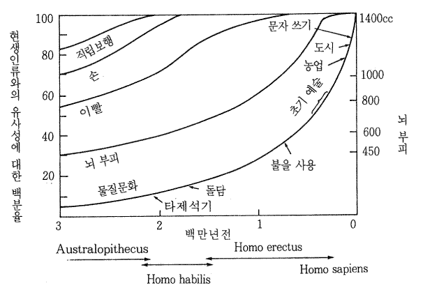 ³úÀÇ ÁøÈ¿Í Çൿ ´É·ÂÀÇ Áõ°¡´Â Çö»ý Àηù¿¡ À̸£¸é¼ ±Þ¼Óµµ·Î ÁøÀüµÇ¾ú´Ù(<±×¸² 6> ÂüÁ¶). Çö»ýÀηù (È£¸ð »çÇÇ¿£½º) °¡ ³ªÅ¸³ ¾à 20 ¸¸³â Àü¿¡´Â ³úÀÇ ºÎÇǰ¡ ÇöÀçÀÇ ¼öÁØÀÎ ¾à 1,400cc Á¤µµ°¡ µÇ¾ú´Ù. ¿À½ºÆ®¶ö·ÎÇÇÅ×Äí½º°¡ µµ±¸¸¦ »ç¿ëÇØ ¿Â ¾à 200¸¸³â µ¿¾È¿¡´Â ³úÀÇ Å©±â°¡ º° º¯È¾øÀÌ Áö¼ÓµÇ¾î ¿ÔÁö¸¸, ±× ´ÙÀ½ 50¸¸³â µ¿¾È¿¡´Â ³úÀÇ ºÎÇǰ¡ 3¹è³ª Ä¿Á³´Ù.