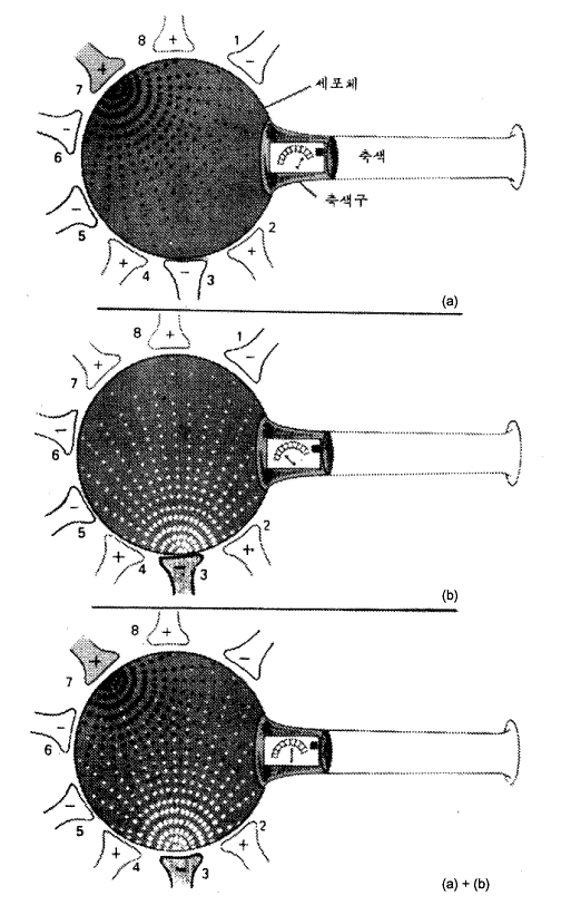 ´Ù¸¥ ¼¼Æ÷ÀÇ Ãà»ö°ú ±× ¼ö»óµ¹±âÀÇ Á¢ÃËÁ¡À» ½Ã³À½º ¶ó ÇÔÀº ÀÌ¹Ì ¾ð±ÞÇß´Ù. ÀÌ ½Ã³À½º´Â ½ÅÈ£¸¦ ´Ù¸¥ ¼¼Æ÷·Î Àü´ÞÇÏ´Â ¿ªÇÒÀ» Çϴµ¥, ½Ã³À½º¿¡´Â µÎ °¡Áö À¯ÇüÀÌ ÀÖ´Ù. Çϳª´Â »ó´ë¹æ ¼¼Æ÷¸¦ ÈïºÐ½ÃŰ´Â ½ÅÈ£¸¦ Àü´ÞÇÏ´Â ½Ã³À½ºÀ̰í, ¶Ç Çϳª´Â ½ÅÈ£°¡ ¿À¸é ¼¼Æ÷³»ÀÇ ÈïºÐÀ» ¾ïÁ¦ÇÏ´Â ½ÅÈ£¸¦ Àü´ÞÇÏ´Â ½Ã³À½ºÀÌ´Ù. <±×¸² 7>¿¡ ±×µé ½Ã³À½º ¿ªÇÒÀ» ¼³¸íÇÏ´Â ¿¹°¡ ³ª¿Í ÀÖ´Ù. ¿©±â¼´Â ½Å°æ¼¼Æ÷¸¦ ±Ý¼Ó°øÀ¸·Î, ¼ö»óµ¹±â´Â ±×°Í¿¡ ´ê´Â ¼èÆÄÀÌÇÁ·Î ³ªÅ¸³»°í ÀÖ´Ù. ÀÌ ½ÇÇèÀº ÈïºÐ¼º ½Ã³À½º´Â ¶ß°Å¿î °ø±â, ¾ïÁ¦¼º ½º³À½º´Â Âù °ø±â¸¦ ³»µµ·Ï ÇÔÀ¸·Î½á ½Å°æ¼¼Æ÷ÀÇ ÇൿÀ» ºÐ¼®Çϱâ À§ÇÑ °ÍÀÌ´Ù.