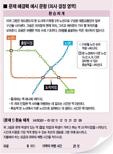 ÁöÇÏö¿ª ³ë¼±µµ¸¦ ±×·Á³õ°í µµÂøÁöÁ¡±îÁö ½Ã°£°ú ºñ¿ëÀ» °¡Àå Àû°Ô µéÀÏ ¼ö ÀÖ´Â ÃÖ¼±ÀÇ °æ·Î¸¦ ±×¸² À§¿¡ Ç¥½ÃÇϰí, ÁöºÒÇØ¾ß ÇÏ´Â ¿ä±Ý°ú ´ë·«ÀÇ ¿©Çà½Ã°£À» ÀûÀ¸¶ó°í Çϴ âÀÇ·Â ¿ä±¸ ¹®Á¦¿¡¼ Çѱ¹ ÇлýµéÀÌ ¼¼°è ÃÖ°ÀÓÀ» °ú½ÃÇß´Ù. °æÁ¦Çù·Â°³¹ß±â±¸(OECD)°¡ Áö³ 12¿ù 7ÀÏ ¹ßÇ¥ÇÑ ¡®PISA(Çо÷¼ºÃëµµ ±¹Á¦ºñ±³) 2003³â¡¯ °á°ú¿¡ µû¸£¸é ¿ì¸®³ª¶ó ¸¸ 15¼¼(°í1) ÇлýµéÀÌ OECD±¹°¡¸¦ Æ÷ÇÔÇÑ 40°³±¹ÀÇ Çлýµé Áß ¡®¹®Á¦Çذá·Â¡¯ ¿µ¿ª¿¡¼ ¼¼°è 1À§¸¦ Â÷ÁöÇß´Ù. ¹®Á¦Çذá·ÂÀ̶õ ÇѸ¶µð·Î ³¸¼± »óȲ¿¡ óÇßÀ» ¶§ ±×°ÍÀ» ÀÎÁö(ìãò±) °úÁ¤À» ÅëÇØ ÇØ°áÇÏ´Â ´É·ÂÀ» ¸»ÇÑ´Ù. ¹®Á¦Çذá·Â ¿µ¿ªÀº ´Ü¼øÈ÷ Áö½ÄÀ» Æò°¡ÇÏ´Â µ¥ ±×Ä¡Áö ¾Ê°í Áö½ÄÀ» ½ÇÁ¦»ýȰ¿¡ Ȱ¿ëÇÒ ¼ö ÀÖ´Â ¼Ò¾çÀ» Æò°¡ÇÑ´Ù. ÀÌ ¹®Á¦ÀÇ Æò±Õ Á¤´ä·üÀº ³ôÁö ¾Ê¾Ò´Ù. ÇÏÀ§±Ç ÇлýµéÀº ÀÌ·± ¹®Á¦ ÀÚü¸¦ ¾î·Á¿öÇϰí, »óÀ§±Ç ÇлýµéÀº ¹º°¡ º¹ÀâÇÑ ÇÔÁ¤ÀÌ ÀÖÀ» °ÍÀ̶ó°í »ý°¢Ç߱⠶§¹®ÀÌ´Ù. ¿ì¸®³ª¶ó ÇлýµéÀÇ Á¤´ä·üÀº 40°³±¹ Æò±Õº¸´Ù ³ô¾Ò´Ù´Â ¼³¸íÀÌ´Ù. º£¸£³ª¸£ À§°í´Ï¿¡ OECD ºÎ±¹ÀåÀº ¡°¹®Á¦Çذá·ÂÀÌ ¹Ù·Î âÀǼº°ú Á÷°áµÇ´Â °ÍÀº ¾Æ´ÏÁö¸¸, Çѱ¹ ÇлýµéÀÇ Á÷°ü·ÂÀÌ ¶Ù¾î³ª´Ù´Â °ÍÀÌ Áõ¸íµÆ±â ¶§¹®¿¡ âÀÇ·ÂÀÌ ³ô´Ù°í ÇÒ ¼ö ÀÖ´Ù ¡±°í ¸»Çß´Ù. ¹®Á¦ - ȯ½Âü°è X415Q01 - 01 02 11 12 13 21 22 99 À§ ±×¸²Àº ÇöÀç ÇлýÀÌ ÀÖ´Â ¿ª(Ãâ¹ß ÁöÁ¡)°ú ÇлýÀÌ °¡·Á°í ÇÏ´Â ¿ª(µµÂøÁöÁ¡)À» ³ªÅ¸³½´Ù. ½Ã°£°ú ºñ¿ëÀ» °¡Àå Àû°Ô µéÀÏ ¼ö ÀÖ´Â ÃÖ¼±ÀÇ °æ·Î¸¦ ±×¸² À§¿¡ Ç¥½ÃÇϰí ÁöºÒÇØ¾ß ÇÏ´Â ¿ä±Ý°ú ´ë·«ÀÇ ¿©Çà ½Ã°£À» ÀûÀ¸½Ã¿À. ¢Â È£ÁÖ °í±³ ¹°¸®½ÃÇèÀº? ¡®¸¶ÀÌŬ Á¶´ø 2.5ÃÊ Ã¼°ø¡¯ÁøÀ§¸¦ ³íÇÏ¶ó ¡®¸¶ÀÌŬ Á¶´øÀÌ ½¸ÇÒ ¶§ °øÁß¿¡ 2.5ÃÊ µ¿¾È ¶° ÀÖÀ» ¼ö ÀÖ´Ù´Â ½ºÆ÷Ã÷ ÀâÁö ±â»çÀÇ ÁøÀ§¸¦ ³íÇ϶ó.¡¯ À̰ÍÀº Áö³ 12¿ù 3ÀÏ ½Ç½ÃµÈ È£ÁÖ °íµîÇб³ Á¹¾÷ ÀڰݽÃÇè ¹°¸® °ú¸ñ¿¡ ³ª¿Â ¹®Á¦·Î ÀûÀýÇÑ ¼öÇаø½ÄÀ» »ç¿ëÇØ¼ ÀÚ½ÅÀÇ ³í°Å¸¦ µÞ¹ÞħÇÒ ¼ö ÀÖ¾î¾ß¸¸ Á¡¼ö¸¦ ¹ÞÀ» ¼ö ÀÖ´Â ¹®Á¦¶ó°í È£ÁÖÀÇ ½Ãµå´Ï ¸ð´× Çì·²µåÁö°¡ ¼Ò°³Çß´Ù. ½Å¹®Àº Á¶´øÀÌ 2.5ÃÊ µ¿¾È °øÁß¿¡ ¸Ó¹«¸£±â À§Çؼ´Â ¾ó¸¶³ª ³ôÀÌ ¶Ù´À³Ä°¡ ¹®Á¦ÀÇ ÇÙ½ÉÀ̶ó¸ç ÀÌ ¹®Á¦¸¦ ³õ°í Çлýµé »çÀÌ¿¡¼ °¡Àå ¸¹Àº ¸»ÀÌ ¿À°í °¬´Ù°í ÀüÇß´Ù. ÀÌ ½Å¹®Àº ÇÑ ¹°¸®±³»çÀÇ ¸»À» Àοë, ¼öÇаø½ÄÀ» ÀÌ¿ëÇØ¼ ¹®Á¦¸¦ Ç®¾îº» °á°ú °øÁß¿¡ 2.5ÃÊ µ¿¾È ¸Ó¹«¸£±â À§Çؼ´Â ¹«·Á 7m¸¦ ¶Ù¾î¾ß ÇÑ´Ù´Â °è»êÀÌ ³ª¿Â´Ù¸ç ±â»ç¸¦ ÀÛ¼ºÇÑ ±âÀÚ°¡ °úÀåÇßÀ» °¡´É¼ºÀÌ Å©´Ù°í ¾²´Â °Ô Á¤´ä¿¡ °¡±õ´Ù°í ÀüÇß´Ù.