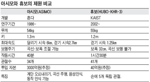 ±¹³» Àü¹®°¡µéÀº ¿ì¸® Áö´ÉÇü ·Îº¿ÀÇ °æÀï·ÂÀ» 100À¸·Î µÎ¾úÀ» ¶§ ÀϺ»Àº 121 ¼öÁØÀ¸·Î º¸°í ÀÖ´Ù. Á¾ÇÕ´É·Â Ãø¸é¿¡¼ 10³âÀÇ Â÷°¡ ÀÖ´Ù. 2010³â±îÁö 100´ë 105 ¼öÁØÀ¸·Î °ÝÂ÷¸¦ Á¼È÷´Â °Ô ¿ì¸® ¸ñÇ¥´Ù. ÀϺ» ·Îº¿ÀÇ ¹Ì·¡´Â È¥´Ù°¡ ¸¸µç ¡®¾Æ½Ã¸ð(ASIMO)¡¯·Î ´ëÇ¥µÈ´Ù. 2000³â¿¡ ù ¼±À» º¸¿© ¿ÃÇØ 6»ìÀÌ µÆ´Âµ¥, ÇØ¸¶´Ù ´«ºÎ½Ã°Ô ÁøÈÇϰí ÀÖ´Ù. 2000³â ´ç½Ã 120§¯¿´´ø ۵µ ÀÛ³âºÎÅÍ 130§¯·Î Ä¿Á³´Ù. 1»ì ¶§´Â 1½Ã°£¿¡ 1.6§°¸¦ °È´Â ´À¸²º¸¿´Áö¸¸, ÃÖ½ÅÇüÀº ½Ã¼Ó 6§°·Î »¡¶óÁ³´Ù. º¸º´(ܯܲ)ÀÇ Æò±Õ Ç౺¼Óµµ(½Ã¼Ó 4§°)¸¦ ´É°¡ÇÏ´Â, ¼¼°è¿¡¼ °¡Àå ºü¸¥ Àΰ£Çü ·Îº¿ÀÌ´Ù. 2004³â ½Ã¼Ó 3§°¿´´ø °Í¿¡ ºñÇϸé, ºÒ°ú 1³â ¸¸¿¡ 2¹è³ª »¡¶óÁ³´Ù. ¾Æ½Ã¸ð´Â Àå¾Ö¹°À» ÇÇÇØ Áö±×Àç±×·Î ´Þ¸®´Â ´É·Âµµ ÀÖ´Ù. °è´ÜÀ» ¿À¸£³»¸®°Å³ª, °î¼± º¸Ç൵ °¡´ÉÇÏ´Ù. ¡®0.08ÃÊ¡¯¶ó´Â ªÀº ½Ã°£À̱ä ÇÏÁö¸¸, µÎ ¹ßÀÌ µ¿½Ã¿¡ Áö¸é¿¡¼ ¶³¾îÁ® °øÁß¿¡ ¸Ó¹° ¼ö ÀÖ´Ù. º¸ÆøÀÇ Å©±â¿Í ¹æÇâÀ» ½º½º·Î Á¶ÀýÇÏ´Â ´É·ÂÀ» °®Ãè±â ¶§¹®ÀÌ´Ù. »ç¶÷ÀÌ ÀÚ½ÅÀ» º¸¸é °í°³¸¦ õ¿¬´ö½º·´°Ô µ¹¸®´Â µî Àΰ£ µ¿ÀÛ¿¡µµ ¹ÝÀÀÇÑ´Ù. »ç¶÷ ¸»µµ ¾Ë¾Æµè´Â´Ù. 50¿©°³ÀÇ ÀϺ»¾î Áú¹®°ú Àλ縻À» ¾Ë¾Æµè°í, 30¿©°³ÀÇ ¸í·ÉÀ» ½ÇÇà¿¡ ¿Å±ä´Ù. È¥´Ù ÄÚ¸®¾ÆÀÇ Á¤Áö¿¬¾¾´Â ¡°³»³âºÎÅÍ È¥´Ù ȸ»ç¸¦ ¹æ¹®ÇÏ´Â »ç¶÷µéÀÇ ¾È³»¸¦ ¸ÃÀ» ¿¹Á¤¡±À̶ó°í ¸»Çß´Ù. ¾Æ½Ã¸ð¿¡ ´ëÇÑ ¿ì¸®ÀÇ ´ëÀÀÀº ¡®ÈÞº¸¡¯´Ù. ¾Æ½Ã¸ð¿Í ÈÞº¸´Â ÇÑ·ÀÏ ¾ç±¹ ±â¼úÀÇ ÇöÁÖ¼Ò¸¦ º¸¿©ÁØ´Ù. KAIST ¿À ¹Ú»çÆÀÀÌ °³¹ßÇÑ ÈÞº¸´Â 2004³â¸» ¿µ±¹¿¡¼ ù ¼±À» º¸¿´´Ù. ¾Æ½Ã¸ðº¸´Ù Ű(120§¯)´Â Á¶±Ý ÀÛ°í, ¸ö¹«°Ô(55§¸)´Â 1§¸ ´õ ³ª°£´Ù. ¾ÆÁ÷Àº ¿òÁ÷ÀÓÀÌ µÐÇÑ ÆíÀÌ´Ù. 1½Ã°£¿¡ 1.25§°. ¾Æ½Ã¸ð¿¡ ºñ±³ÇÏ¸é °ÉÀ½¸¶ ¼öÁØÀÌ´Ù. °È´Â ÆøÀ» Á¶ÀýÇÒ ´É·ÂÀÌ ¾ø¾î ÇÑ ¹ßÀ» ¶¿ ¶§¸¶´Ù Á¤È®È÷ 32§¯¸¸ ¿òÁ÷ÀδÙ. °î¼± º¸Çà ´É·ÂÀ̳ª °è´ÜÀ» ¿À¸£³»¸± ¼öµµ ¾ø´Ù. ´ë½Å ´Ù¼¸ ¼Õ°¡¶ô¿¡ µ¶¸³ °üÀýÀ» ´Þ¾Æ °¡À§ ¹ÙÀ§ º¸¸¦ ÇÒ ¼ö ÀÖ´Ù. ¾Æ½Ã¸ð´Â ÇÏÁö ¸øÇÏ´Â µ¿ÀÛÀÌ´Ù. ±×·¸°Ô º¸¸é ¾Æ½Ã¸ð¿Í ÈÞº¸´Â Àü¿ø·±¸µ¿·Á¦¾î´É·Â¿¡¼´Â ¾ùºñ½ÁÇÑ ¼öÁØÀ̶õ ÆòÀÌ´Ù. ¹°·Ð ÅõÀÔµÈ °³¹ßºñ(40¾ï¿©¿ø)³ª ¿¬±¸±â°£(3³â)À» °¨¾ÈÇϸé Áö³ 86³â ÀÌÈÄ 3000¾ï¿ø °¡·® ÅõÀÔµÈ ¾Æ½Ã¸ð¿Í ºñ±³ÇÏ´Â °ÍÀº ¾ÆÁ÷ ¹«¸®´Ù. ªÀº ½Ã°£¿¡ °ÅµÐ ¼º°úÀ̱⿡ ¹ßÀü °¡´É¼ºÀº ¹«ÇÑÇÏ´Ù.