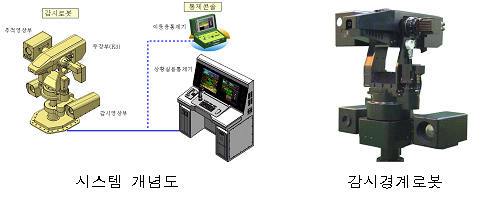 감시경계로봇 독자개발…내년말 군대·공항 배치 - 24시간 감시·경계 가능…야간 인식기능 `탁월` - 야간 2km내 물체 자동탐지…적 제압기능도 탑재 : 조선일보, 이데일리 이정훈기자, 2006/09/28 : 이르면 내년말부터 군부대와 공항에 사람을 대신할 수 있는 감시경계로봇이 등장할 전망이다. 산업자원부는 28일 오후 삼성 천안연수원에서 정세균 장관과 이선희 방위사업청장, 군 관계자들이 참석한 가운데 감시경계로봇을 전격 공개한다고 밝혔다. 이번에 국내 독자 기술로 개발된 감시경계로봇은 24시간 감시와 경계가 가능한 지능형 로봇으로, 정부와 민간에서 3년간 총 98억원의 자금을 쏟아부어 만든 작품이다. ◆감시경계로봇 시스템 구성과 형상
