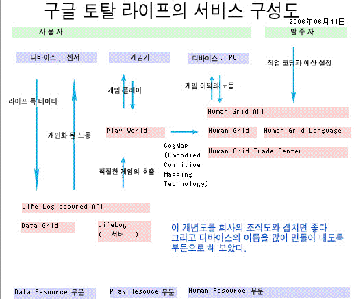 휴먼 그리드란 문자 그대로 인간 그리드이다. 그리드•컴퓨팅이라는 계산기 과학의 분야가 있다. 이것은 휴면 중인 계산기 자원들을 통합해 하나의 계산기로 간주해 대규모 계산을 실행하기 위한 계산기 아키텍처를 말한다. 인간 그리드에서는 휴면 중인 계산기가 아니고 휴면 중인 인간을 이용한다. 예를 들어 100만명이 넘는 인간 두뇌의 능력을 통합해 하나의 컴퓨터로 간주한다. 그 초기적인 예로는 인력 검색이라는 이른바 커뮤니티 사이트도 여기에 속할까. 그러나 이러한 시스템에서는 즉각대응성이 낮다고 말할 수 있다. 만약 회의도중 갑자기 알고 싶은 것이 있다고 할 때에 인력 검색은 질문 후 되돌아 오는 대답에는 2시간 정도의 시간이 걸려 조금 늦다. CGM(Consumer Generated Media)에 즉각대응성이 요구되면 그것은 인간 그리드가 된다. 동시에 수백만명 이상의 뇌자원이 이용 가능하기 때문에 통계적으로 3초 이내에서 해답이 되돌아 오는 것을 보장할 수 있다. 이 때문에 이 요구는 프로그램에서부터 호출할 수 있게 된다. 이렇듯이 프로그램에서부터 호출할 수 있는 인간 그리드야말로 아마존 매커니컬 터크(Amazon Mechanical Turk)이다. 원래 일에는 인간이 잘하는 일과 기계가 잘하는 일이 있다. 이 중 기계가 잘하는 것은 프로그래밍하여 처리하는 일이고 인간이 잘하는 것은 프로그램 안에서「여기는 인간이 한다」고 프로그래밍 해버린다. 그것을 실행할 때 그 일이 시장에 맞아 떨어져 3센트 정도의 매우 싼 가격으로 인터넷 어딘가의 인간이 해낸다. "매커니컬 터크"란 원래 18 세기말에 유럽에서 화제가 되었던 체스 기계에서 유래한다. 이 터크는 전 세계를 순회하며 프랭클린이나 나폴레옹에게도 이긴 것 같지만 실제 이 기계안에는 인간이 들어와 체스를 가리키고 있었던 것이다. 아마존 매커니컬 터크는 최종 사용자가 보면 어디까지나 프로그래밍된 기계에 지나지 않는다. 그러나 기계의 저쪽편에 있는 불특정 다수의「인간 그리드」를 조직화 해 종래의 AI나 컴퓨터가 할 수 없는 일을「코딩」하는 것이다. 실시간 반응하는 수백만 명의 인간 그리드 노드를 조달하기 위해서 구글이 주목한 것이 온라인 게임이었다. 온라인 게임에서 놀고 있는 사람들을 인간 그리드의 노드로 해 의뢰인에게서 발주가 오면 구글이 그 일을 게임으로 변환해 많은 사람에게 인식시킨다. 이것이 게임 플레이•워킹 구조이다. 아래에 게임 플레이•워킹을 실행하기 위한 구글 토탈 라이프의 서비스 구성도를 그렸다.